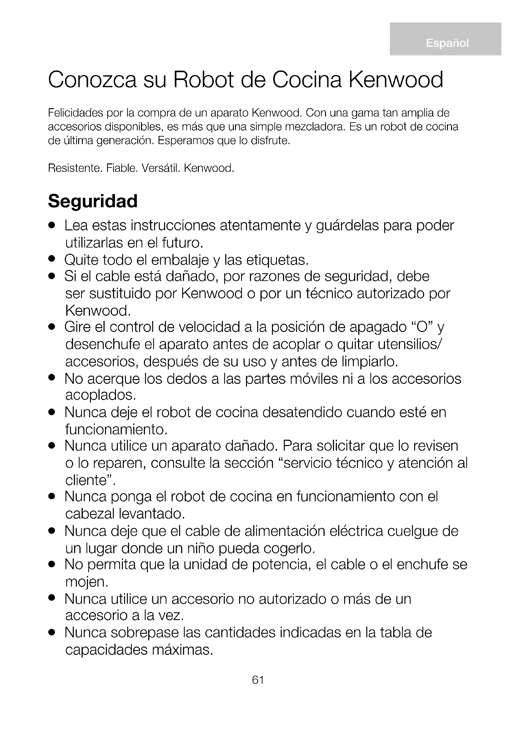 Utilice este aparato únicamente para el uso doméstico al que está destinado. Kenwood no se hará cargo de responsabilidad alguna si el aparato se somete a un uso inadecuado o si no se siguen estas instrucciones. Antes de enchufar el aparato