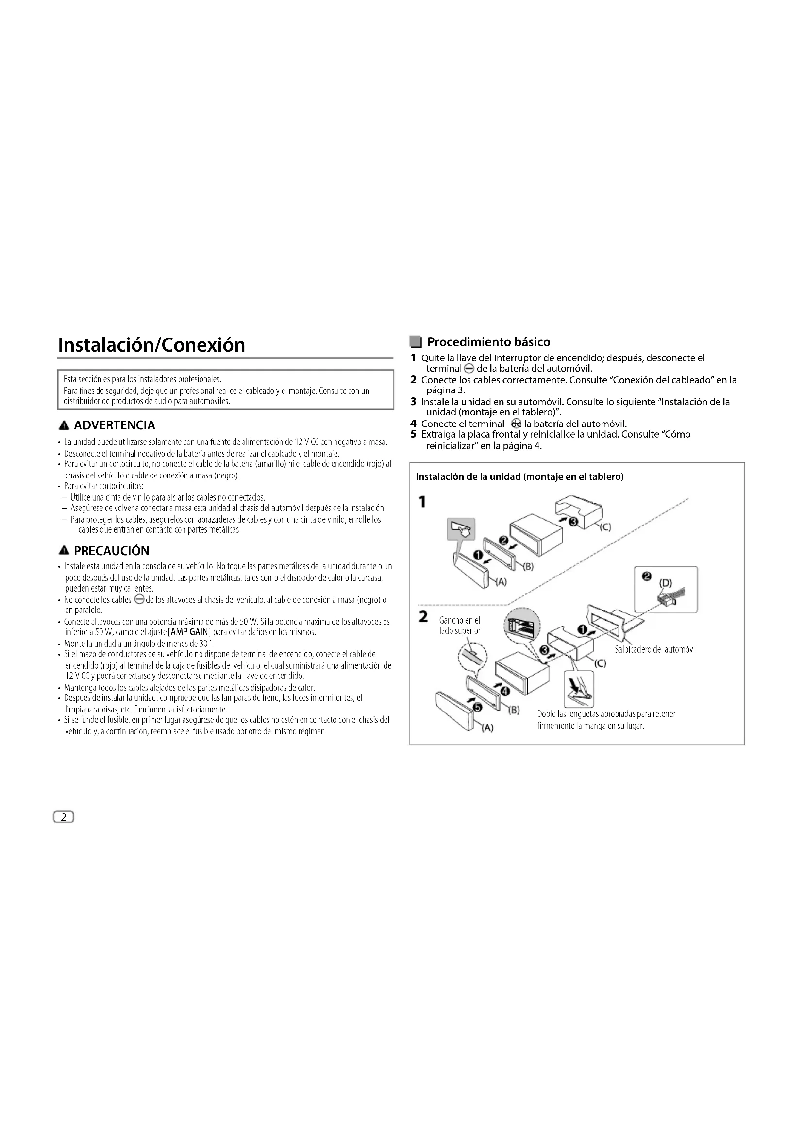 [COLORFLOW03] : Color changes at different speeds. JS_JVC_QSG_KD_X176_E_EN_int1.indd 8JS_JVC_QSG_KD_X176_E_EN_int1.indd 8 4/18/2019 12:04:36 PM4/18/2019 12:04:36 PMJS_JVC_QSG_KD_X176_E_EN_int1.indd 9JS_JVC_QSG_KD_X176_E_EN_int1.indd 9 4/18/2019 12:04:37 PM4/18/2019 12:04:37 PM2 Data Size: B6L (182 mm x 128 mm)Book Size: B6L (182 mm x 128 mm) Procedimiento básico 1 Quite la llave del interruptor de encendido; después, desconecte el terminal de la batería del automóvil. 2 Conecte los cables correctamente. Consulte “Conexión del cableado” en la página 3. 3 Instale la unidad en su automóvil. Consulte lo siguiente “Instalación de la unidad (montaje en el tablero)”. 4 Conecte el terminal de la batería del automóvil. 5 Extraiga la placa frontal y reinicialice la unidad. Consulte “Cómo reinicializar” en la página 4. Instalación de la unidad (montaje en el tablero) Salpicadero Instalación/Conexión Esta sección es para los instaladores profesionales. Para fines de seguridad, deje que un profesional realice el cableado y el montaje. Consulte con un distribuidor de productos de audio para automóviles. ADVERTENCIA