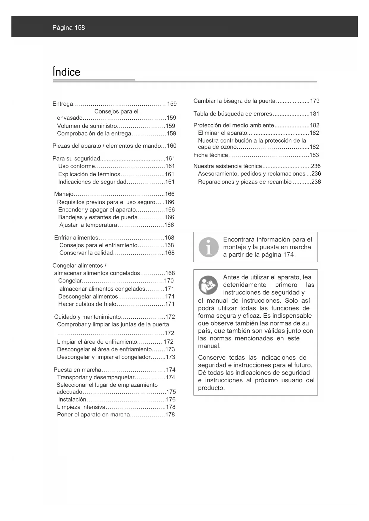 - Limpieza intensiva………………………….178 Poner el aparato en marcha………………178 Cambiar la bisagra de la puerta p. 179