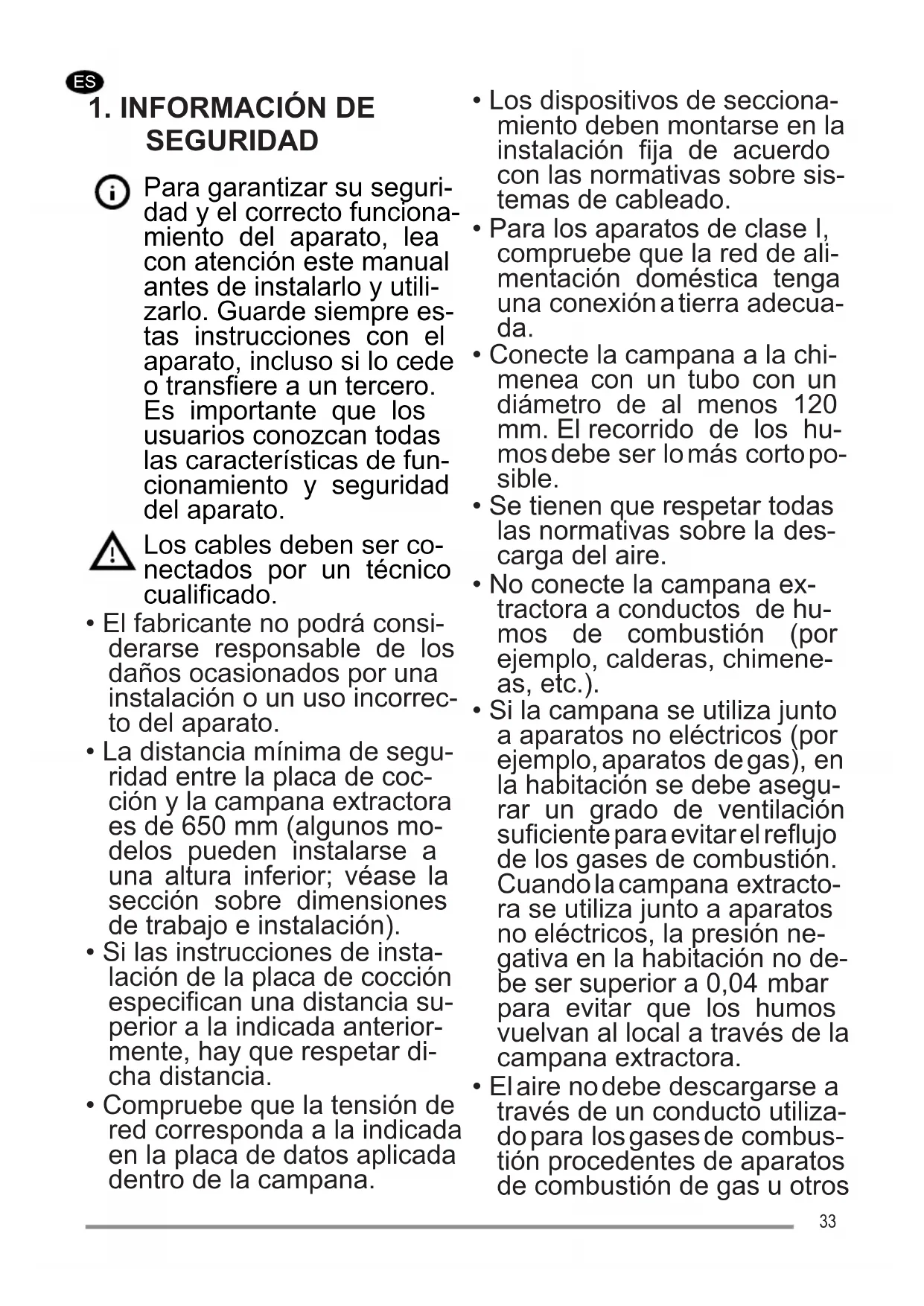 SEGURIDAD Para garantizar su seguri- dad y el correcto funciona- miento del aparato, lea con atención este manual antes de instalarlo y utili- zarlo. Guarde siempre es- tas instrucciones con el aparato, incluso si lo cede o transfiere a un tercero. Es importante que los usuarios conozcan todas las características de fun- cionamiento y seguridad del aparato. Los cables deben ser co- nectados por un técnico cualificado.