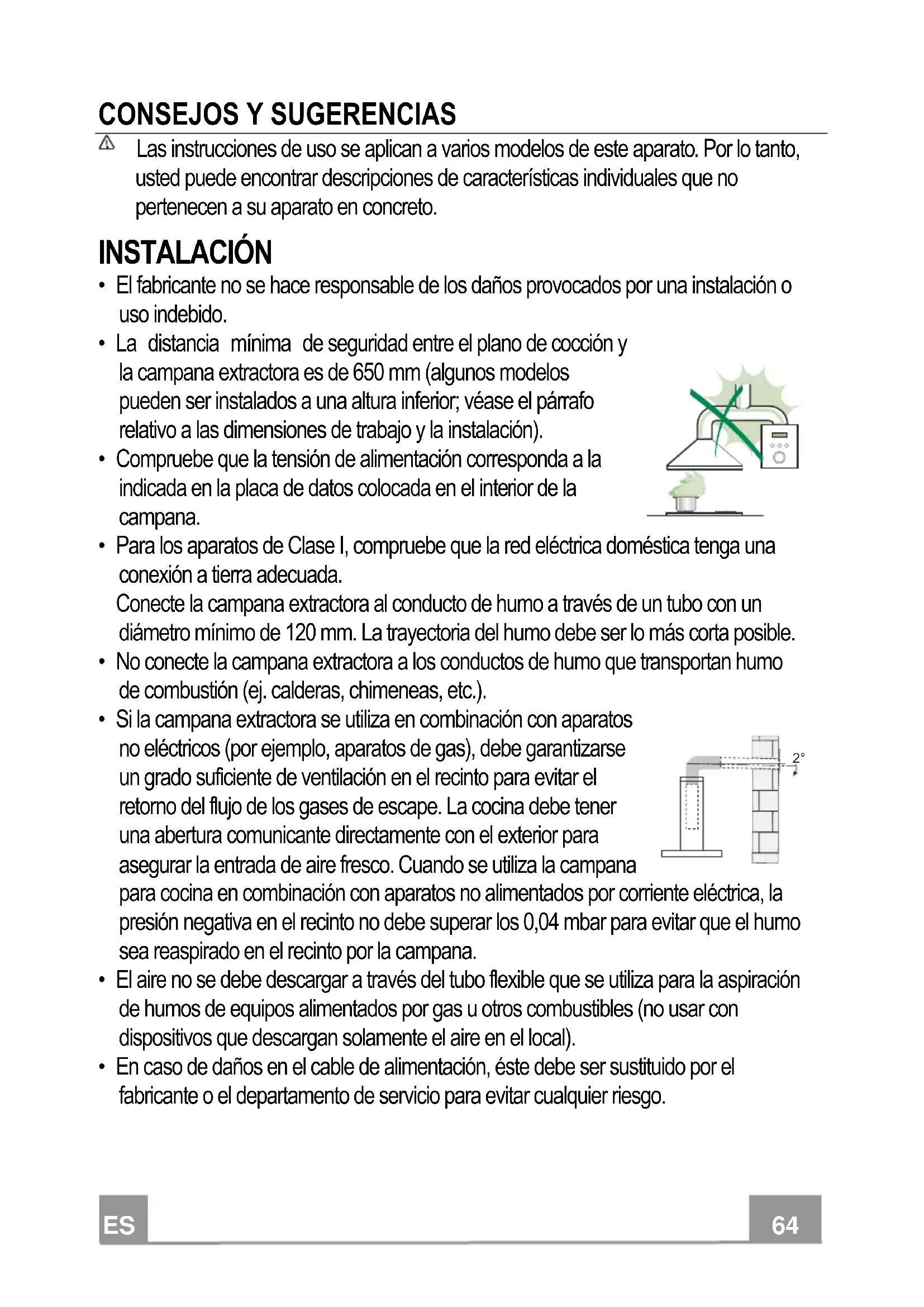 - Si la campana extractora se utiliza en combinación con aparatos no eléctricos (por ejemplo, aparatos de gas), debe garantizarse un grado suficiente de ventilación en el recinto para evitar el retorno del flujo de los gases de escape. La cocina debe tener una abertura comunicante directamente con el exterior para asegurar la entrada de aire fresco. Cuando se utiliza la campana para cocina en combinación con aparatos no alimentados por corriente eléctrica, la presión negativa en el recinto no debe superar los 0,04 mbar para evitar que el humo sea reaspirado en el recinto por la campana.