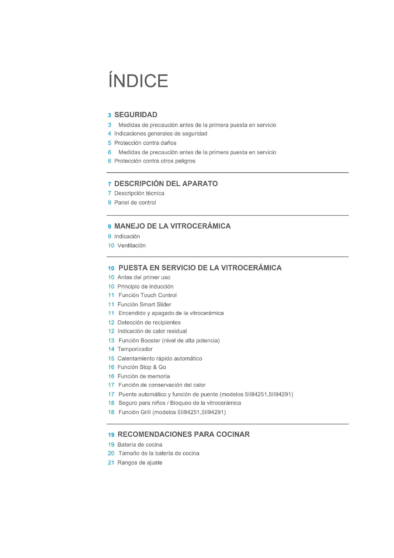 9 Indicación 10 Ventilación 10 PUESTA EN SERVICIO DE LA VITROCERÁMICA 10 Antes del primer uso 10 Principio de inducción 11 Función Touch Control 11 Función Smart Slider 11 Encendido y apagado de la vitrocerámica 12 Detección de recipientes 12 Indicación de calor residual 13 Función Booster (nivel de alta potencia) 14 Temporizador 15 Calentamiento rápido automático 16 Función Stop & Go 16 Función de memoria 17 Función de conservación del calor 17 Puente automático y función de puente (modelos 5II84251,5II94291) 18 Seguro para niños / Bloqueo de la vitrocerámica 18 Función Grill (modelos 5II84251,5II94291)