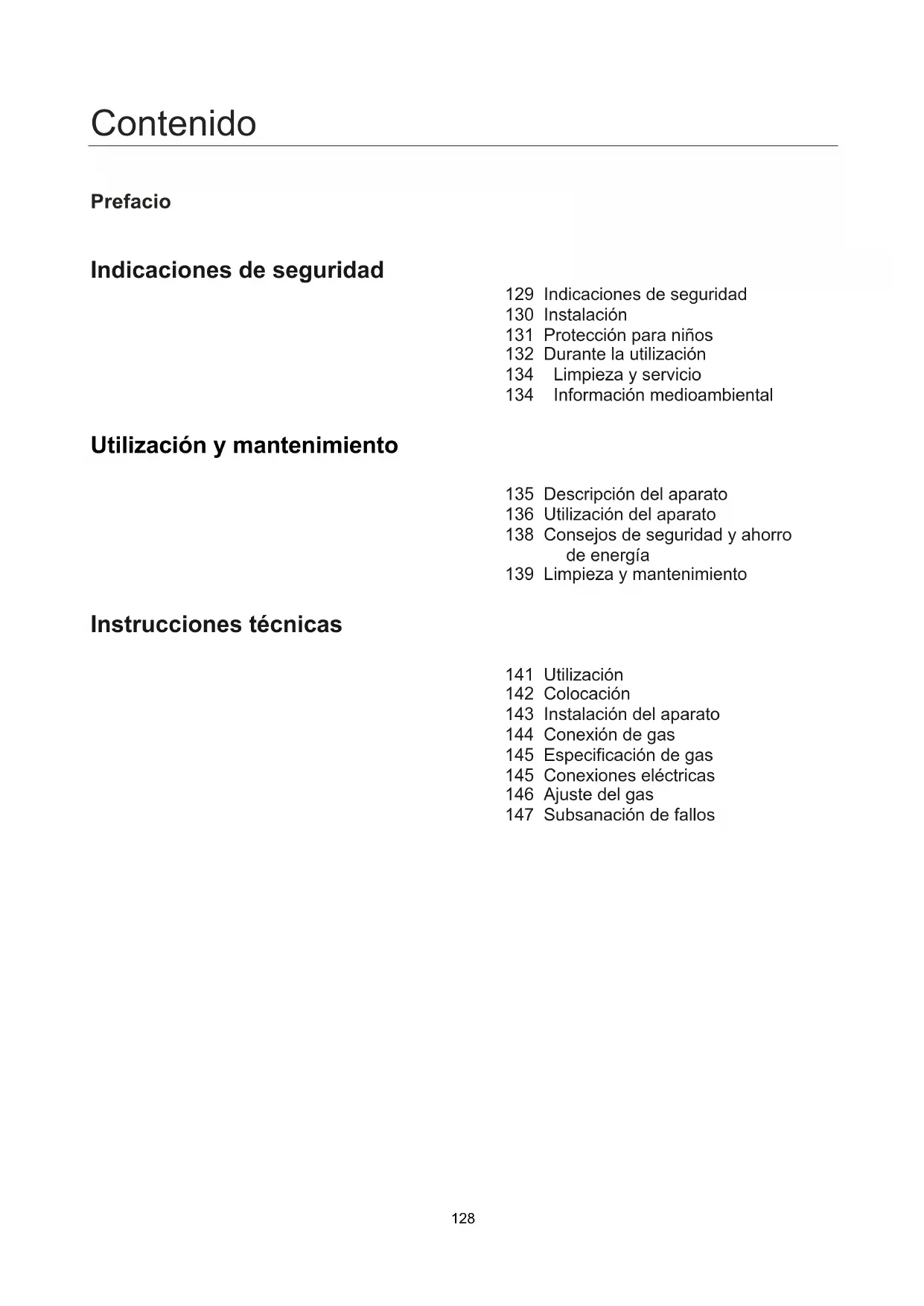 ■ Om problemet inte kan lösas skall du kontakta kundtjänst.128 Contenido Prefacio Indicaciones de seguridad 129 Indicaciones de seguridad 130 Instalación 131 Protección para niños 132 Durante la utilización 134 Limpieza y servicio 134 Información medioambiental Utilización y mantenimiento 135 Descripción del aparato 136 Utilización del aparato 138 Consejos de seguridad y ahorro de energía 139 Limpieza y mantenimiento Instrucciones técnicas 141 Utilización 142 Colocación 143 Instalación del aparato 144 Conexión de gas 145 Especificación de gas 145 Conexiones eléctricas 146 Ajuste del gas 147 Subsanación de fallos129 Indicaciones de seguridad ■ Por favor, lea atentamente este manual de servicio antes de instalar o utilizar el aparato. ■ Guarde estas instrucciones de uso para futuras consultas. Al vender o entregar el aparato a un nuevo usuario, deberá adjuntarse también este manual de servicio. ■ El fabricante se exime de toda responsabilidad si no se tienen en cuenta estas medidas de seguridad. ■ Las siguientes indicaciones están diseñadas para una fácil comprensión, para evitar así accidentes por un uso incorrecto y para poder manejar el aparato cómodamente. ■ Lea atentamente los siguientes capítulos.