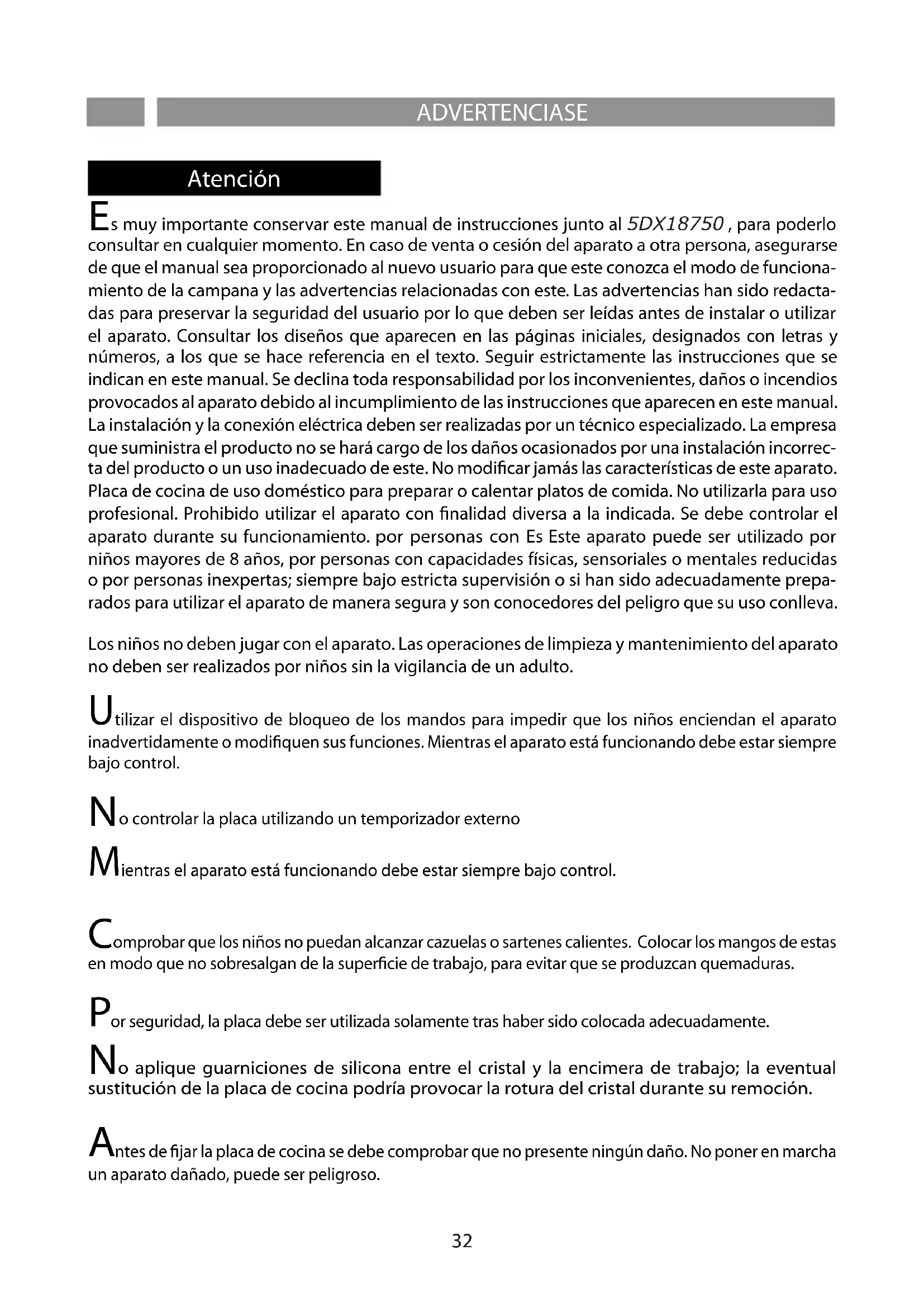s muy importante conservar este manual de instrucciones junto al 5DX18750 , para poderlo consultar en cualquier momento. En caso de venta o cesión del aparato a otra persona, asegurarse de que el manual sea proporcionado al nuevo usuario para que este conozca el modo de funciona- miento de la campana y las advertencias relacionadas con este. Las advertencias han sido redacta- das para preservar la seguridad del usuario por lo que deben ser leídas antes de instalar o utilizar el aparato. Consultar los diseños que aparecen en las páginas iniciales, designados con letras y números, a los que se hace referencia en el texto. Seguir estrictamente las instrucciones que se indican en este manual. Se declina toda responsabilidad por los inconvenientes, daños o incendios provocados al aparato debido al incumplimiento de las instrucciones que aparecen en este manual. La instalación y la conexión eléctrica deben ser realizadas por un técnico especializado. La empresa que suministra el producto no se hará cargo de los daños ocasionados por una instalación incorrec- ta del producto o un uso inadecuado de este. No modicar jamás las características de este aparato. Placa de cocina de uso doméstico para preparar o calentar platos de comida. No utilizarla para uso profesional. Prohibido utilizar el aparato con nalidad diversa a la indicada. Se debe controlar el aparato durante su funcionamiento. por personas con Es Este aparato puede ser utilizado por niños mayores de 8 años, por personas con capacidades físicas, sensoriales o mentales reducidas o por personas inexpertas; siempre bajo estricta supervisión o si han sido adecuadamente prepa- rados para utilizar el aparato de manera segura y son conocedores del peligro que su uso conlleva. Los niños no deben jugar con el aparato. Las operaciones de limpieza y mantenimiento del aparato no deben ser realizados por niños sin la vigilancia de un adulto.