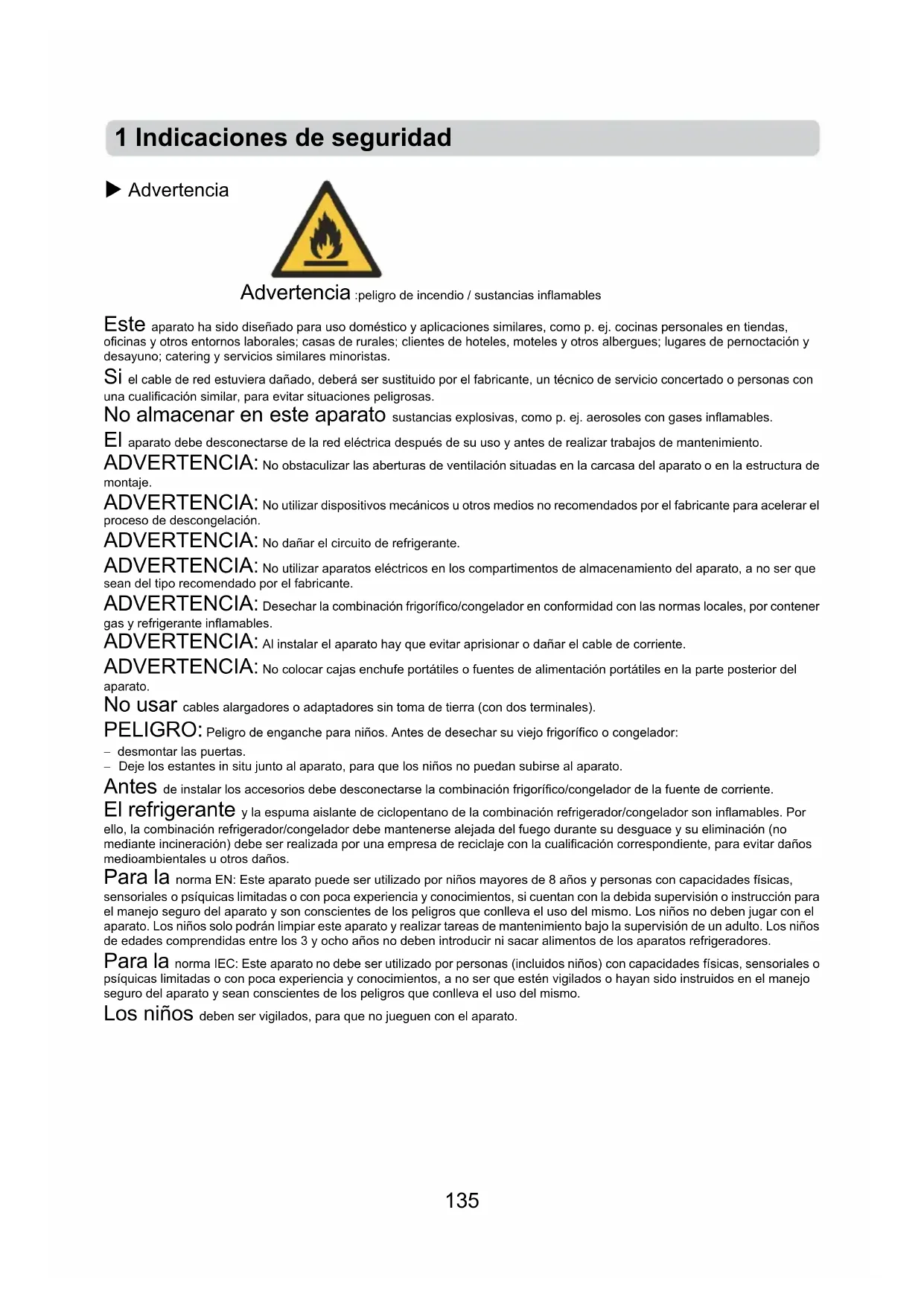 Advertencia :peligro de incendio / sustancias inflamables Este aparato ha sido diseñado para uso doméstico y aplicaciones similares, como p. ej. cocinas personales en tiendas, oficinas y otros entornos laborales; casas de rurales; clientes de hoteles, moteles y otros albergues; lugares de pernoctación y desayuno; catering y servicios similares minoristas. Si el cable de red estuviera dañado, deberá ser sustituido por el fabricante, un técnico de servicio concertado o personas con una cualificación similar, para evitar situaciones peligrosas. No almacenar en este aparato sustancias explosivas, como p. ej. aerosoles con gases inflamables. El aparato debe desconectarse de la red eléctrica después de su uso y antes de realizar trabajos de mantenimiento. ADVERTENCIA: No obstaculizar las aberturas de ventilación situadas en la carcasa del aparato o en la estructura de montaje. ADVERTENCIA: No utilizar dispositivos mecánicos u otros medios no recomendados por el fabricante para acelerar el proceso de descongelación. ADVERTENCIA: No dañar el circuito de refrigerante. ADVERTENCIA: No utilizar aparatos eléctricos en los compartimentos de almacenamiento del aparato, a no ser que sean del tipo recomendado por el fabricante. ADVERTENCIA: Desechar la combinación frigorífico/congelador en conformidad con las normas locales, por contener gas y refrigerante inflamables. ADVERTENCIA: Al instalar el aparato hay que evitar aprisionar o dañar el cable de corriente. ADVERTENCIA: No colocar cajas enchufe portátiles o fuentes de alimentación portátiles en la parte posterior del aparato. No usar cables alargadores o adaptadores sin toma de tierra (con dos terminales). PELIGRO: Peligro de enganche para niños. Antes de desechar su viejo frigorífico o congelador: - desmontar las puertas. - Deje los estantes in situ junto al aparato, para que los niños no puedan subirse al aparato. Antes de instalar los accesorios debe desconectarse la combinación frigorífico/congelador de la fuente de corriente. El refrigerante y la espuma aislante de ciclopentano de la combinación refrigerador/congelador son inflamables. Por ello, la combinación refrigerador/congelador debe mantenerse alejada del fuego durante su desguace y su eliminación (no mediante incineración) debe ser realizada por una empresa de reciclaje con la cualificación correspondiente, para evitar daños medioambientales u otros daños. Para la norma EN: Este aparato puede ser utilizado por niños mayores de 8 años y personas con capacidades físicas, sensoriales o psíquicas limitadas o con poca experiencia y conocimientos, si cuentan con la debida supervisión o instrucción para el manejo seguro del aparato y son conscientes de los peligros que conlleva el uso del mismo. Los niños no deben jugar con el aparato. Los niños solo podrán limpiar este aparato y realizar tareas de mantenimiento bajo la supervisión de un adulto. Los niños de edades comprendidas entre los 3 y ocho años no deben introducir ni sacar alimentos de los aparatos refrigeradores. Para la norma IEC: Este aparato no debe ser utilizado por personas (incluidos niños) con capacidades físicas, sensoriales o psíquicas limitadas o con poca experiencia y conocimientos, a no ser que estén vigilados o hayan sido instruidos en el manejo seguro del aparato y sean conscientes de los peligros que conlleva el uso del mismo. Los niños deben ser vigilados, para que no jueguen con el aparato. 1 Indicaciones de seguridad136 Las instrucciones deben recoger los siguientes aspectos: Para evitar la contaminación de los alimentos, tenga en cuenta las siguientes instrucciones: - Una apertura prolongada de la puerta puede provocar un fuerte aumento de la temperatura en los compartimentos del aparato. - Limpie regularmente las superficies que estén en contacto con los alimentos y los sistemas de desagüe accesibles. - Limpie el depósito de agua cuando no se utilice durante más de 48 horas. Lave los sistemas de agua conectados a una toma de agua, si no se ha extraído agua durante 5 días. (Nota 1) - Guarde la carne y el pescado crudos en recipientes adecuados en la combinación refrigerador/congelador, para que no entren en contacto con otros alimentos o goteen sobre estos. - Los compartimentos congeladores de dos estrellas son adecuados para guardar alimentos precongelados, guardar o producir crema de helado y producir cubitos de hielo. (Nota 2) - Los compartimentos de una , dos y tres estrellas no son adecuados para congelar alimentos frescos. (Nota 3) - Si el aparato refrigerador permanece vacío durante un período prolongado, desconéctelo, descongélelo, límpielo, séquelo y deje la puerta abierta, para evitar la formación de moho en el interior del aparato. Nota 1, 2, 3: Compruebe por favor si esto afecta a su tipo de compartimento de productos.137