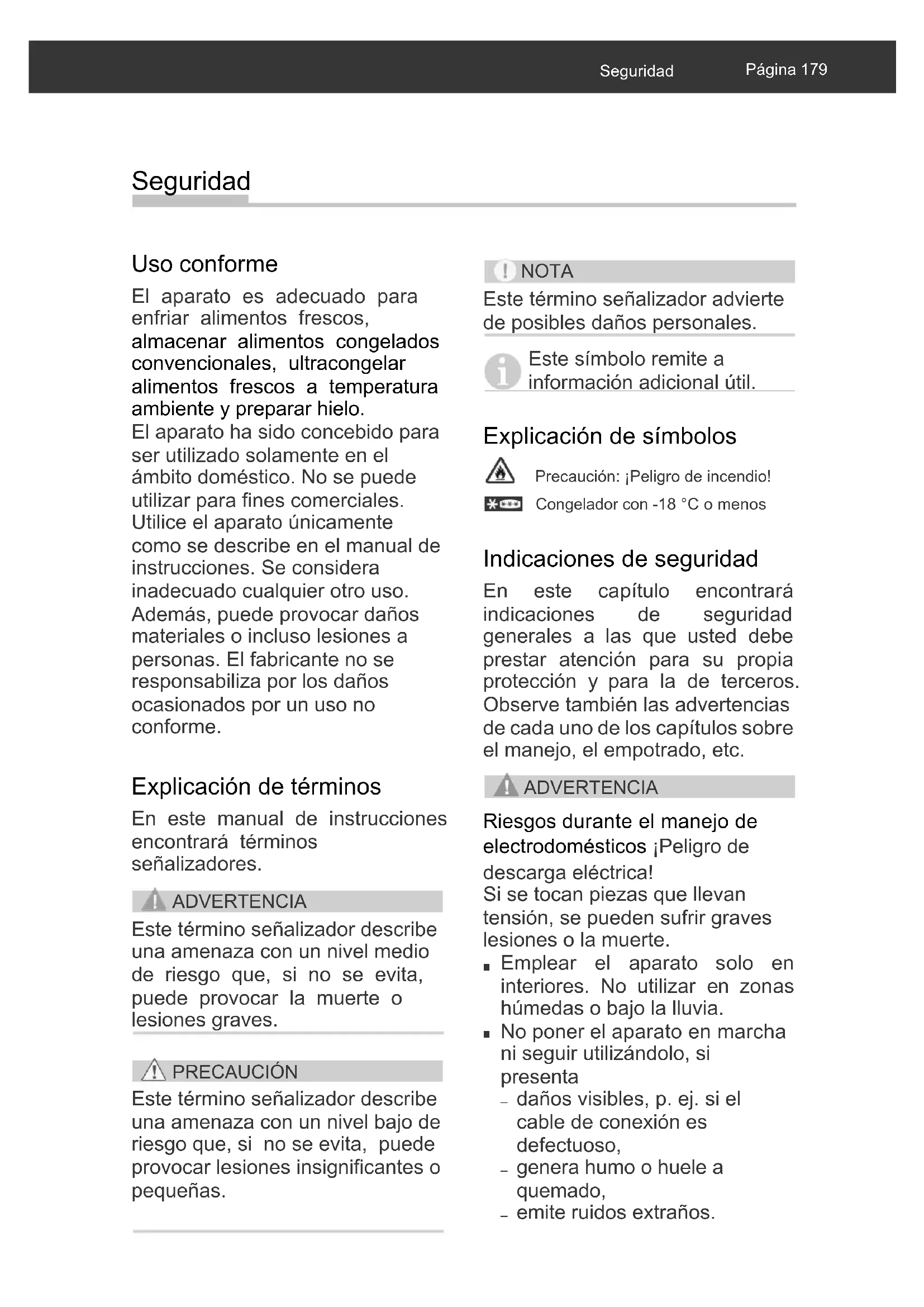 aparato mostrase daños de transporte, póngase en contacto con la asistencia técnica (véase página 263). ¡ADVERTENCIA! ¡Peligro de descarga eléctrica! Nunca ponga en servicio un aparato dañado.Página 178 Piezas del aparato / elementos de mando Piezas del aparato / elementos de mando (1) Congelador (2) Iluminación interior (3) Termostato (4) Bandeja de puerta (5) Compartimento de puerta (6) Botellero (7) Cajones para frutas y verduras (8) Bandeja de cristal, fija (9) Bandeja de cristal, ajustable (1) (2) (3) (7) (8) (9) (4) (5) (6)Seguridad Página 179 Seguridad Uso conforme El aparato es adecuado para enfriar alimentos frescos, almacenar alimentos congelados convencionales, ultracongelar alimentos frescos a temperatura ambiente y preparar hielo. El aparato ha sido concebido para ser utilizado solamente en el ámbito doméstico. No se puede utilizar para fines comerciales. Utilice el aparato únicamente como se describe en el manual de instrucciones. Se considera inadecuado cualquier otro uso. Además, puede provocar daños materiales o incluso lesiones a personas. El fabricante no se responsabiliza por los daños ocasionados por un uso no conforme. Explicación de términos En este manual de instrucciones encontrará términos señalizadores. ADVERTENCIA Este término señalizador describe una amenaza con un nivel medio de riesgo que, si no se evita, puede provocar la muerte o lesiones graves. PRECAUCIÓN Este término señalizador describe una amenaza con un nivel bajo de riesgo que, si no se evita, puede provocar lesiones insignificantes o pequeñas. NOTA Este término señalizador advierte de posibles daños personales. Este símbolo remite a información adicional útil. Explicación de símbolos Precaución: ¡Peligro de incendio! Congelador con -18 °C o menos Indicaciones de seguridad En este capítulo encontrará indicaciones de seguridad generales a las que usted debe prestar atención para su propia protección y para la de terceros. Observe también las advertencias de cada uno de los capítulos sobre el manejo, el empotrado, etc. ADVERTENCIA Riesgos durante el manejo de electrodomésticos ¡Peligro de descarga eléctrica! Si se tocan piezas que llevan tensión, se pueden sufrir graves lesiones o la muerte.