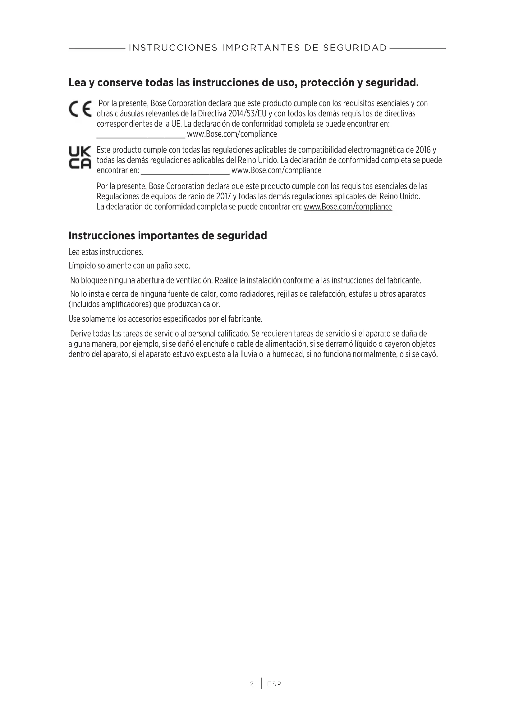 ESP Lea y conserve todas las instrucciones de uso, protección y seguridad. Por la presente, Bose Corporation declara que este producto cumple con los requisitos esenciales y con otrascláusulas relevantes de la Directiva 2014/53/EU y con todos los demás requisitos de directivas correspondientes de la UE. La declaración de conformidad completa se puede encontrar en: www.Bose.com/compliancewww.Bose.com/compliance Este producto cumple con todas las regulaciones aplicables de compatibilidad electromagnética de 2016 y todas las demás regulaciones aplicables del Reino Unido. La declaración de conformidad completa se puede encontrar en: www.Bose.com/compliancewww.Bose.com/compliance Por la presente, Bose Corporation declara que este producto cumple con los requisitos esenciales de las Regulaciones de equipos de radio de 2017 y todas las demás regulaciones aplicables del Reino Unido. Ladeclaración de conformidad completa se puede encontrar en: www.Bose.com/compliancewww.Bose.com/compliance Instrucciones importantes de seguridad Lea estas instrucciones. Límpielo solamente con un paño seco. No bloquee ninguna abertura de ventilación. Realice la instalación conforme a las instrucciones del fabricante. No lo instale cerca de ninguna fuente de calor, como radiadores, rejillas de calefacción, estufas u otros aparatos (incluidos amplificadores) que produzcan calor. Use solamente los accesorios especificados por el fabricante. Derive todas las tareas de servicio al personal calificado. Se requieren tareas de servicio si el aparato se daña de alguna manera, por ejemplo, si se dañó el enchufe o cable de alimentación, si se derramó líquido o cayeron objetos dentro del aparato, si el aparato estuvo expuesto a la lluvia o la humedad, si no funciona normalmente, o si se cayó.INSTRUCCIONES IMPORTANTES DE SEGURIDAD