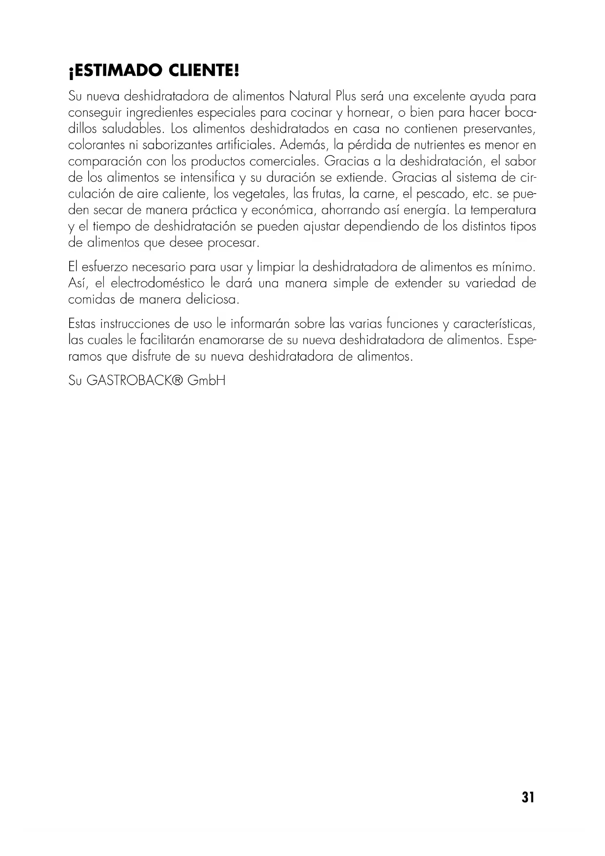 - Garantía ¡ESTIMADO CLIENTE! Su nueva deshidratadora de alimentos Natural Plus será una excelente ayuda para conseguir ingredientes especiales para cocinar y hornear, o bien para hacer boca- dillos saludables. Los alimentos deshidratados en casa no contienen preservantes, colorantes ni saborizantes artificiales. Además, la pérdida de nutrientes es menor en comparación con los productos comerciales. Gracias a la deshidratación, el sabor de los alimentos se intensifica y su duración se extiende. Gracias al sistema de cir- culación de aire caliente, los vegetales, las frutas, la carne, el pescado, etc. se pue- den secar de manera práctica y económica, ahorrando así energía. La temperatura y el tiempo de deshidratación se pueden ajustar dependiendo de los distintos tipos de alimentos que desee procesar. El esfuerzo necesario para usar y limpiar la deshidratadora de alimentos es mínimo. Así, el electrodoméstico le dará una manera simple de extender su variedad de comidas de manera deliciosa. Estas instrucciones de uso le informarán sobre las varias funciones y características, las cuales le facilitarán enamorarse de su nueva deshidratadora de alimentos. Espe- ramos que disfrute de su nueva deshidratadora de alimentos. Su GASTROBACK® GmbH32 p. 5331