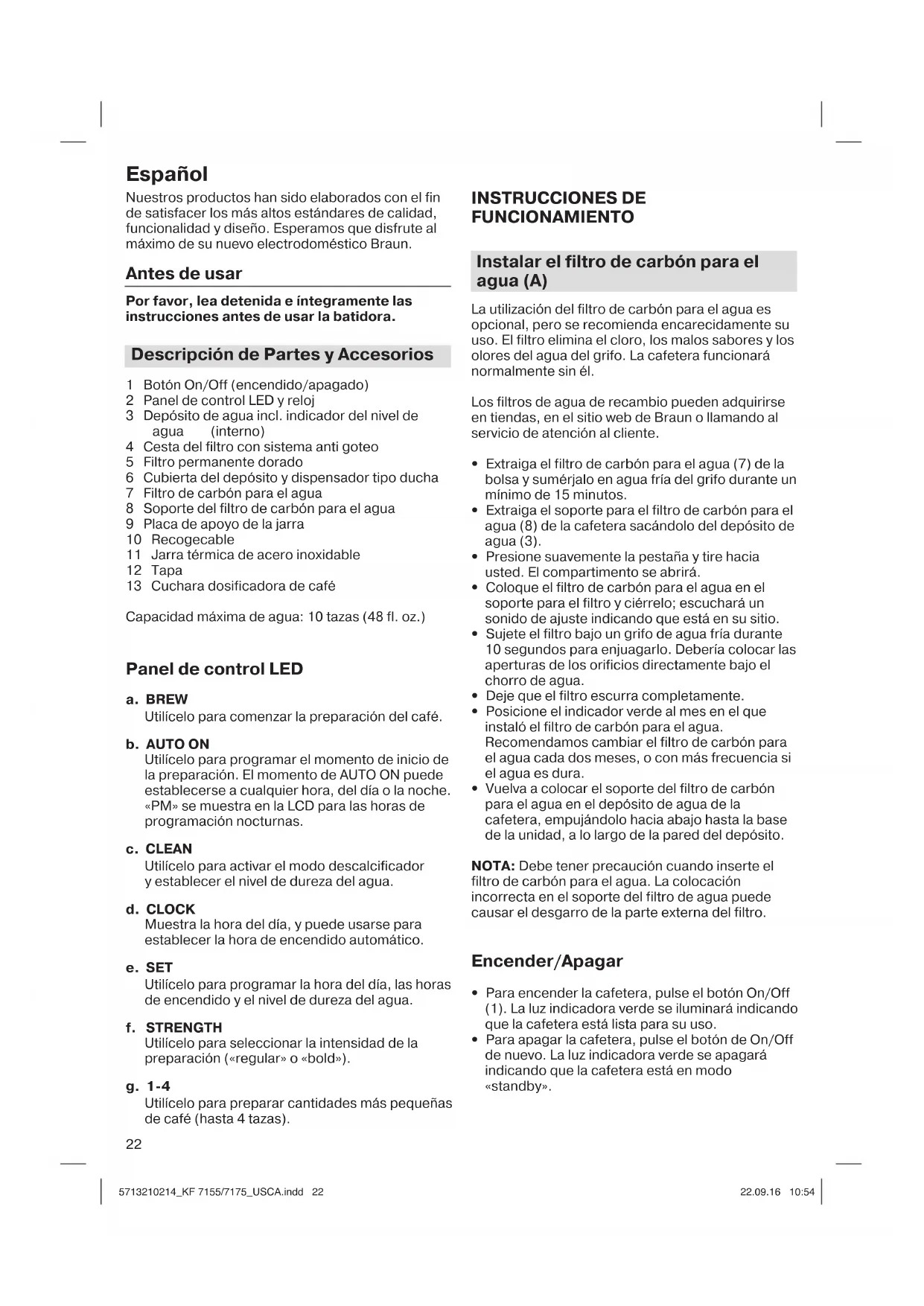 Se suministra un cable de alimentación corto para reducir los riesgos resultantes de engancharse o tropezarse con un cable más largo. No se recomiendan cables de alimentación o cables de extensión desmontables más largos, pero se pueden utilizar si se hace con cuidado. Si se utiliza un cable de extensión: (1) el voltaje eléctrico marcado en el cable o la extensión del cable debe ser al menos tan grande como la potencia eléctrica del aparato, (2) el cable debe colocarse de modo que no cuelgue de un mostrador o mesa donde los niños puedan tirarlo o se pueda tropezar accidentalmente 5713210214_KF 7155/7175_USCA.indd 75713210214_KF 7155/7175_USCA.indd 7 22.09.16 10:5422.09.16 10:548 English 6 Français 14 Español 22 De’Longhi Braun Household GmbH Carl-Ulrich-Straße 4 63263 Neu-Isenburg/Germany 5713210214/09.16 EN/FR/ES 5713210214_KF 7155/7175_USCA.indd 85713210214_KF 7155/7175_USCA.indd 8 22.09.16 10:5422.09.16 10:549