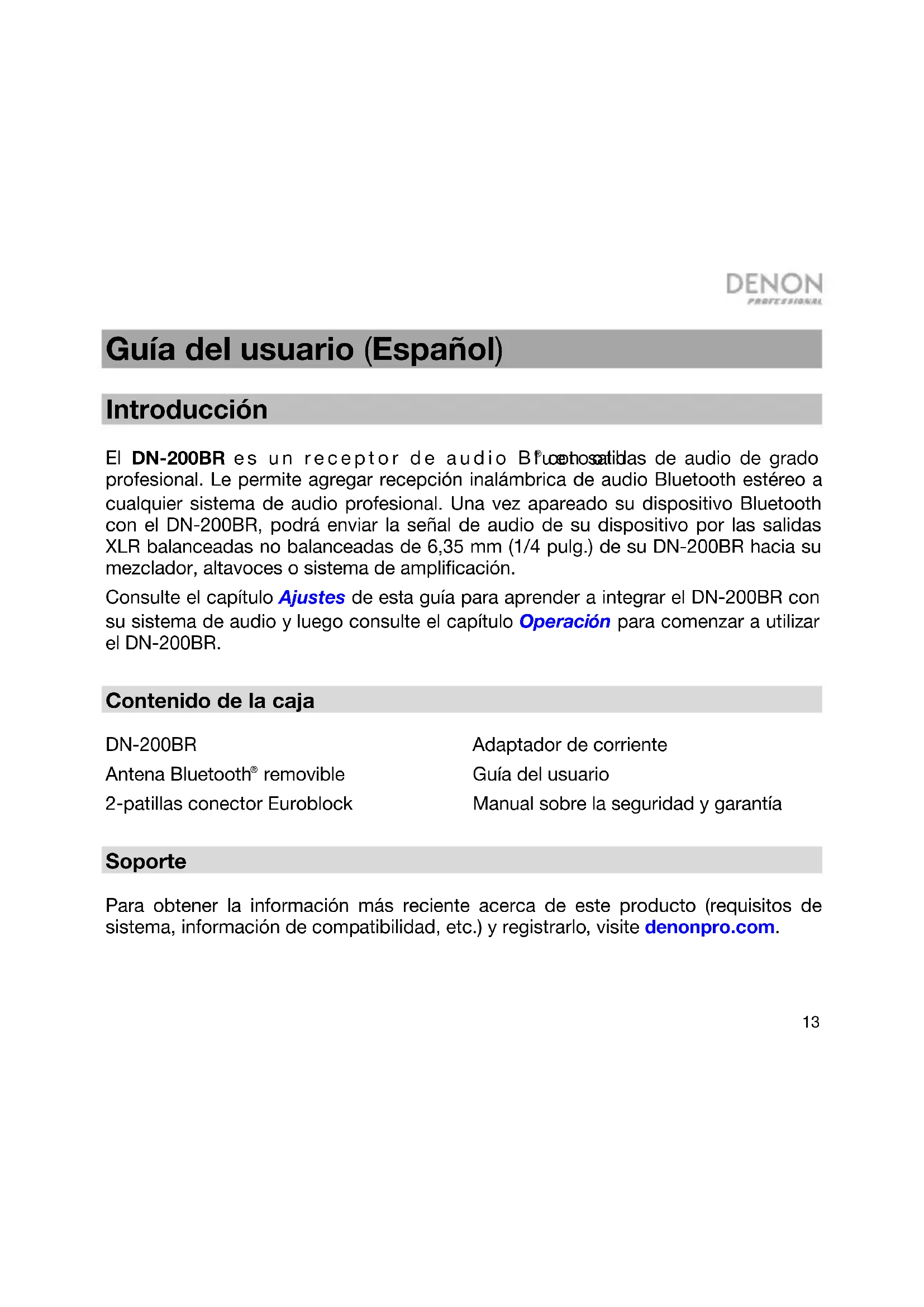 removible 2-patillas conector Euroblock Adaptador de corriente Guía del usuario Manual sobre la seguridad y garantía Soporte Para obtener la información más reciente acerca de este producto (requisitos de sistema, información de compatibilidad, etc.) y registrarlo, visite denonpro.com.14