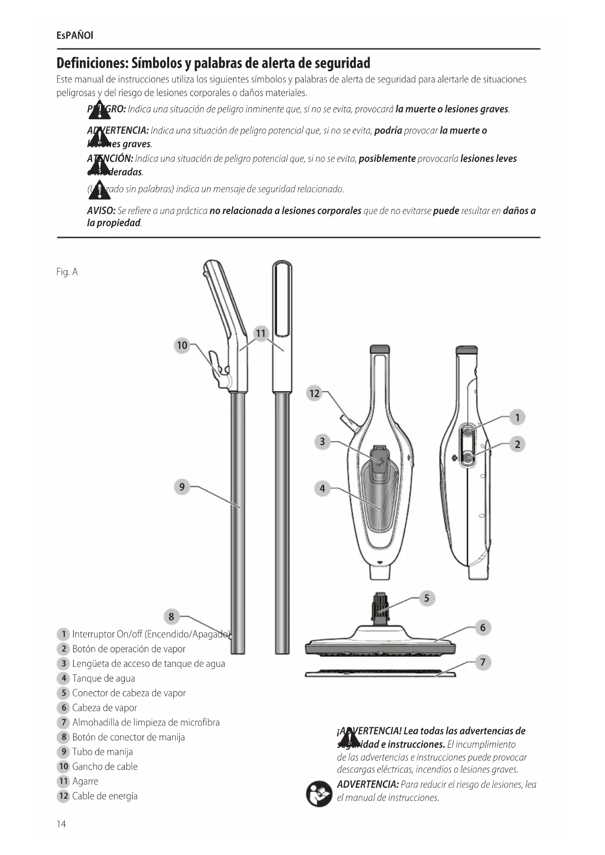 ADVERTENCIA: Es importante monitorear el nivel del agua en el tanque de agua. Para rellenar el tanque de agua y continuar desinfectando/limpiando, vea la sección Llenado del tanque de agua. AVisO: Nunca deje el trapeador de vapor en un lugar en cualquier superficie por un período de tiempo. No almacene con una almohadilla húmeda ya que esto puede dañar su piso. Siempre coloque el trapeador de vapor con el tubo de la manija