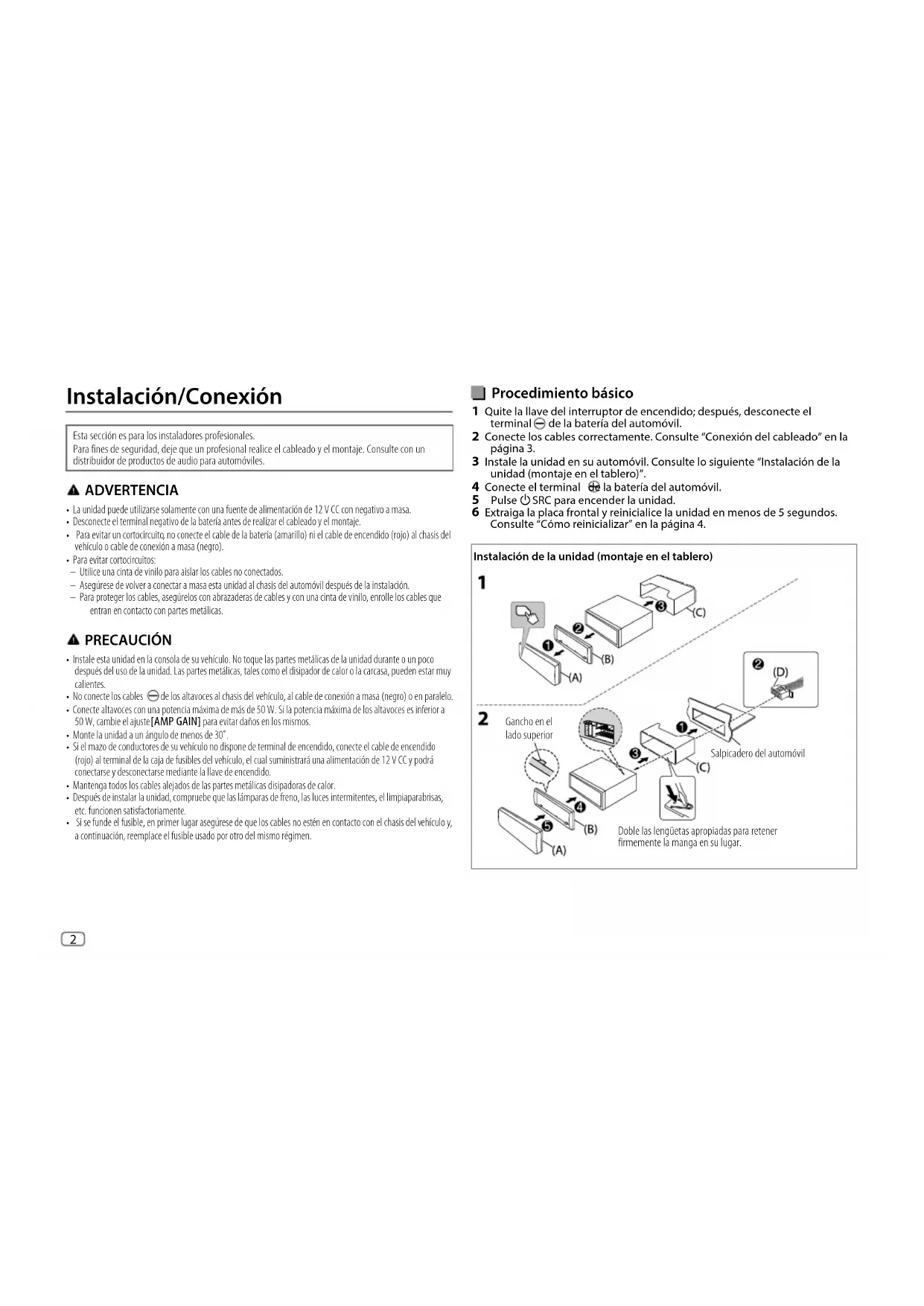 - For KD-T716BT: Pressing enters BT AUDIO directly. 2 Operate the audio player via Bluetooth to start playback. To On the faceplate Play back/pause Press the volume knob. Select group or folder Press 2 J / 1 K. Reverse skip/Forward skip Press S / T. Reverse/Fast-forward Press and hold S / T. Repeat play Press 4 repeatedly. Random play Press 3 repeatedly. JS_JVC_QSG_KD_T812BT_E_EN_1.indd 9JS_JVC_QSG_KD_T812BT_E_EN_1.indd 9 5/29/2019 11:46:50 AM5/29/2019 11:46:50 AM2 Data Size: B6L (182 mm x 128 mm)Book Size: B6L (182 mm x 128 mm) Procedimiento básico 1 Quite la llave del interruptor de encendido; después, desconecte el terminal de la batería del automóvil. 2 Conecte los cables correctamente. Consulte “Conexión del cableado” en la página 3. 3 Instale la unidad en su automóvil. Consulte lo siguiente “Instalación de la unidad (montaje en el tablero)”. 4 Conecte el terminal de la batería del automóvil. 5 Pulse B SRC para encender la unidad. 6 Extraiga la placa frontal y reinicialice la unidad en menos de 5 segundos. Consulte “Cómo reinicializar” en la página 4. Instalación de la unidad (montaje en el tablero) Instalación/Conexión Esta sección es para los instaladores profesionales. Para fines de seguridad, deje que un profesional realice el cableado y el montaje. Consulte con un distribuidor de productos de audio para automóviles. ADVERTENCIA