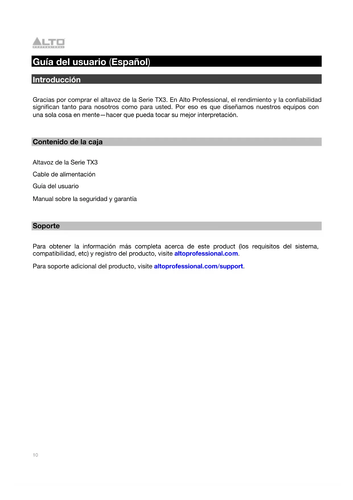 Guía del usuario (Español) Introducción Gracias por comprar el altavoz de la Serie TX3. En Alto Professional, el rendimiento y la confiabilidad significan tanto para nosotros como para usted. Por eso es que diseñamos nuestros equipos con una sola cosa en mente—hacer que pueda tocar su mejor interpretación.