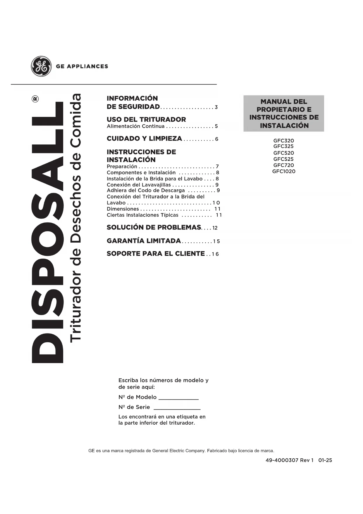 49-4000307 Rev 1 01-25GFC320 GFC325GFC520 GFC525 GFC720GFC10202 49-4000307 Rev 1 GRACIAS POR HACER QUE GE APPLIANCES SEA PARTE DE SU HOGAR. Ya sea que haya crecido usando GE Appliances, o que ésta es su primera vez, nos complace tenerlo en la familia. Sentimos orgullo por el nivel de arte, innovación y diseño de cada uno de los electrodomésticos de GE Appliances, y creemos que usted también. Entre otras cosas, el registro de su electrodoméstico asegura que podamos entregarle información importante del producto y detalles de la garantía cuando los necesite. Registre su electrodoméstico GE ahora a través de Internet. Sitios Web y números telefónicos útiles están disponibles en la sección de Soporte para el Consumidor de este Manual del Propietario. También puede enviar una carta en la tarjeta de inscripción preimpresa que se incluye con el material embalado.49-4000307 Rev 1 3