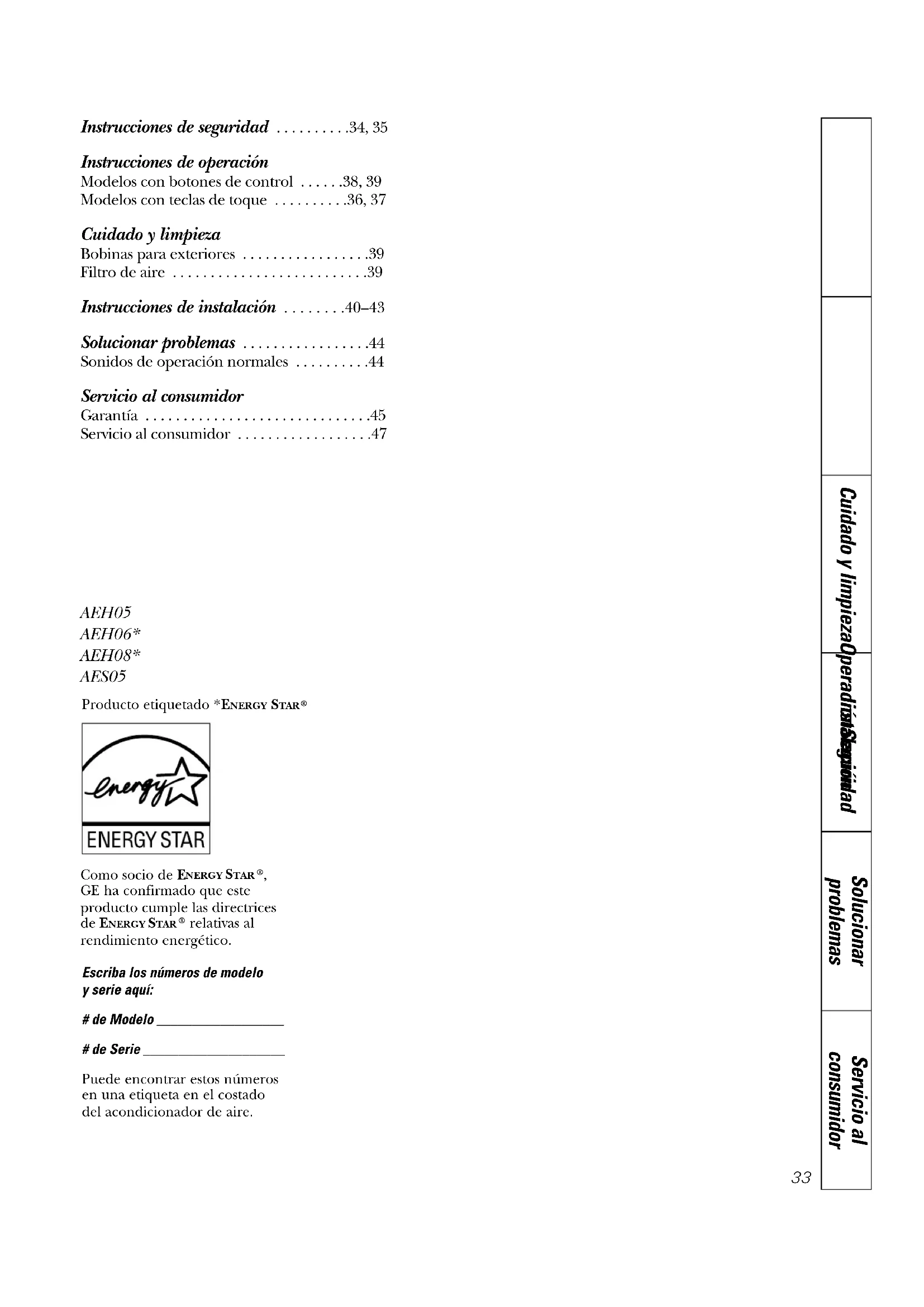 AEH05 AEH06* AEH08* AES05 Servicio al consumidor Solucionar problemas Instalación Cuidado y limpiezaOperaciónSeguridad34 INFORMACIÓN IMPORTANTE DE SEGURIDAD. LEA TODAS LAS INSTRUCCIONES ANTES DE USAR. ¡ADVERTENCIA! Por su seguridad, se debe seguir la información en este manual para minimizar el riesgo de incendios, descargas eléctricas o lesiones personales. ■ Use este electrodoméstico solamente para el propósito determinado según se describeen el Manual del propietario.■ Este acondicionador de aire debe instalarsecorrectamente de acuerdo con lasInstrucciones de instalación antes de su uso. ■ Nunca desenchufe su acondicionador de aire tirando del cable eléctrico. Siempreagarre firmemente el enchufe y tire de él directamente hacia afuera.■ Reemplace inmediatamente todos los cableseléctricos que se hayan pelado o que sehayan dañado de alguna otra manera. Un cable de corriente dañado no deberepararse, sino que debe ser sustituido poruno nuevo que se adquiera del fabricante.No use un cable eléctrico que muestreevidencias de deterioro, o daños de abrasiónen su superficie en alguno de sus extremos.■ Apague la unidad y desenchufe suacondicionador de aire antes de limpiar.■ GE no está no apoya que se le proporcioneningún servicio al acondicionador de aire.Vehementemente recomendamos que usted no intente proporcionar servicio alacondicionador de aire usted mismo. ■ Por su seguridad…no almacene ni usemateriales combustibles, gasolina u otrosvapores o líquidos inflamables en laproximidad de éste o algún otroelectrodoméstico.■ Todos los acondicionadores de aire contiene refrigerantes, los que por LeyFederal deben ser removidos antes dedesecharlos. Si usted planea deshacerse dealgún producto que contenga refrigerantes,póngase en contacto con la compañía que se encarga de recoger su basura para que leindiquen qué hacer.■ Si el receptáculo no coincide con elenchufe, un electricista calificado debereemplazar el receptáculo.