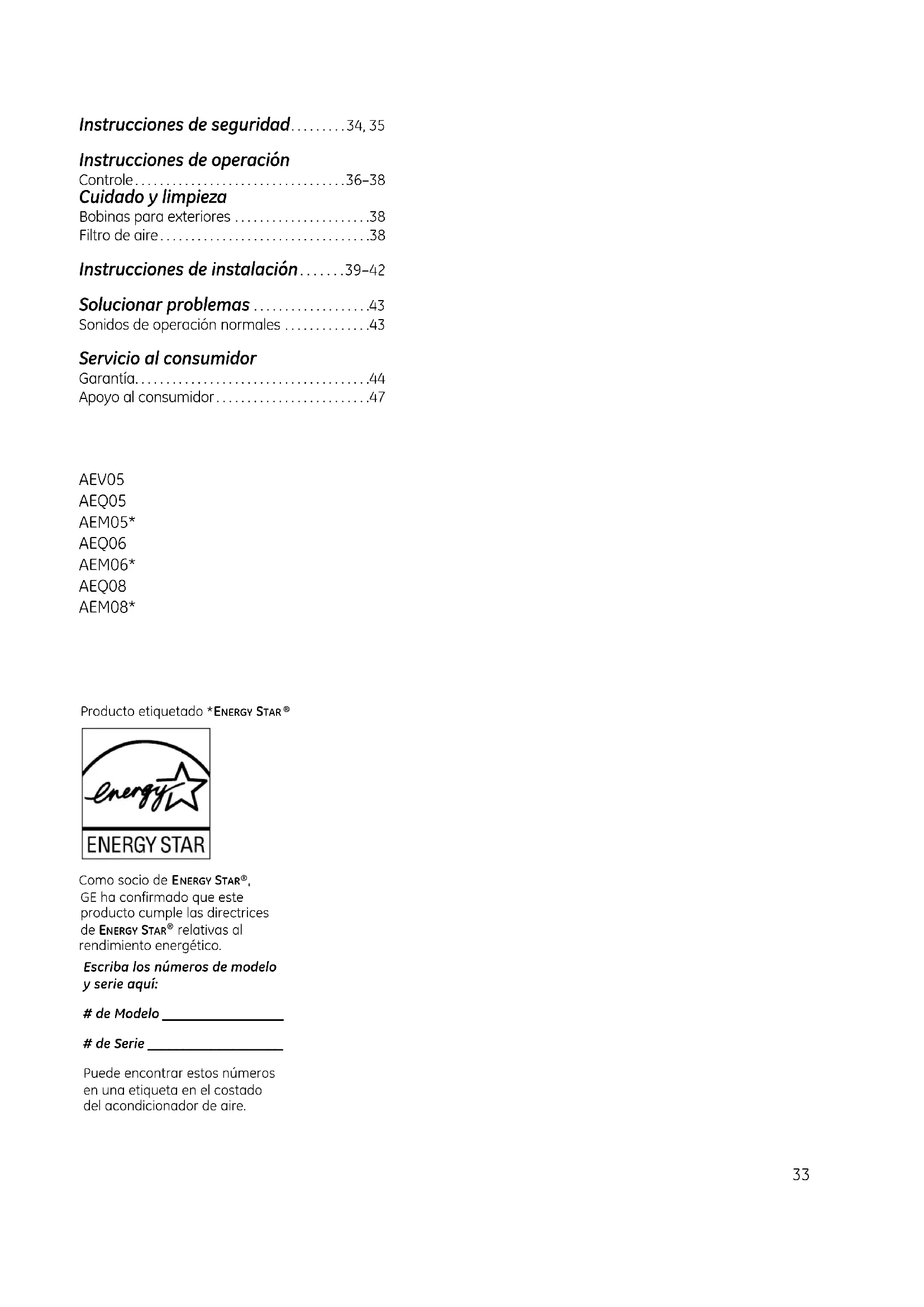AEV05 AEQ05 AEM05* AEQ06 AEM06* AEQ08 AEM08*34 INFORMACIÓN IMPORTANTE DE SEGURIDAD. LEA TODAS LAS INSTRUCCIONES ANTES DE USAR. ¡ADVERTENCIA! Por su seguridad, se debe seguir la información en este manual para minimizar el riesgo de incendios, descargas eléctricas o lesiones personales. n Use este electrodoméstico solamente para el propósito determinado según se describe en el Manual del propietario. n Este acondicionador de aire debe instalarse correctamente de acuerdo con las Instrucciones de instalación antes de su uso. n Nunca desenchufe su acondicionador de aire tirando del cable eléctrico. Siempre agarre firmemente el enchufe y tire de él directamente hacia afuera. n Reemplace inmediatamente todos los cables eléctricos que se hayan pelado o que se hayan dañado de alguna otra manera. Un cable de corriente dañado no debe repararse, sino que debe ser sustituido por uno nuevo que se adquiera del fabricante. No use un cable eléctrico que muestre evidencias de deterioro, o daños de abrasión en su superficie en alguno de sus extremos. n Apague la unidad y desenchufe su acondicionador de aire antes de limpiar. n GE no está no apoya que se le proporcione ningún servicio al acondicionador de aire. Vehementemente recomendamos que usted no intente proporcionar servicio al acondicionador de aire usted mismo. n Por su seguridad…no almacene ni use materiales combustibles, gasolina u otros vapores o líquidos inflamables en la proximidad de éste o algún otro electrodoméstico. n Todos los acondicionadores de aire contiene refrigerantes, los que por Ley Federal deben ser removidos antes de desecharlos. Si usted planea deshacerse de algún producto que contenga refrigerantes, póngase en contacto con la compañía que se encarga de recoger su basura para que le indiquen qué hacer. n Si el receptáculo no coincide con el enchufe, un electricista calificado debe reemplazar el receptáculo. n Estos sistemas de acondicionadores de aire R410A requieren que los contratistas y técnicos usen herramientas, equipos y estándares de seguridad aprobados para su uso con este refrigerante. NO use equipamiento certificado sólo para refrigerante R22.