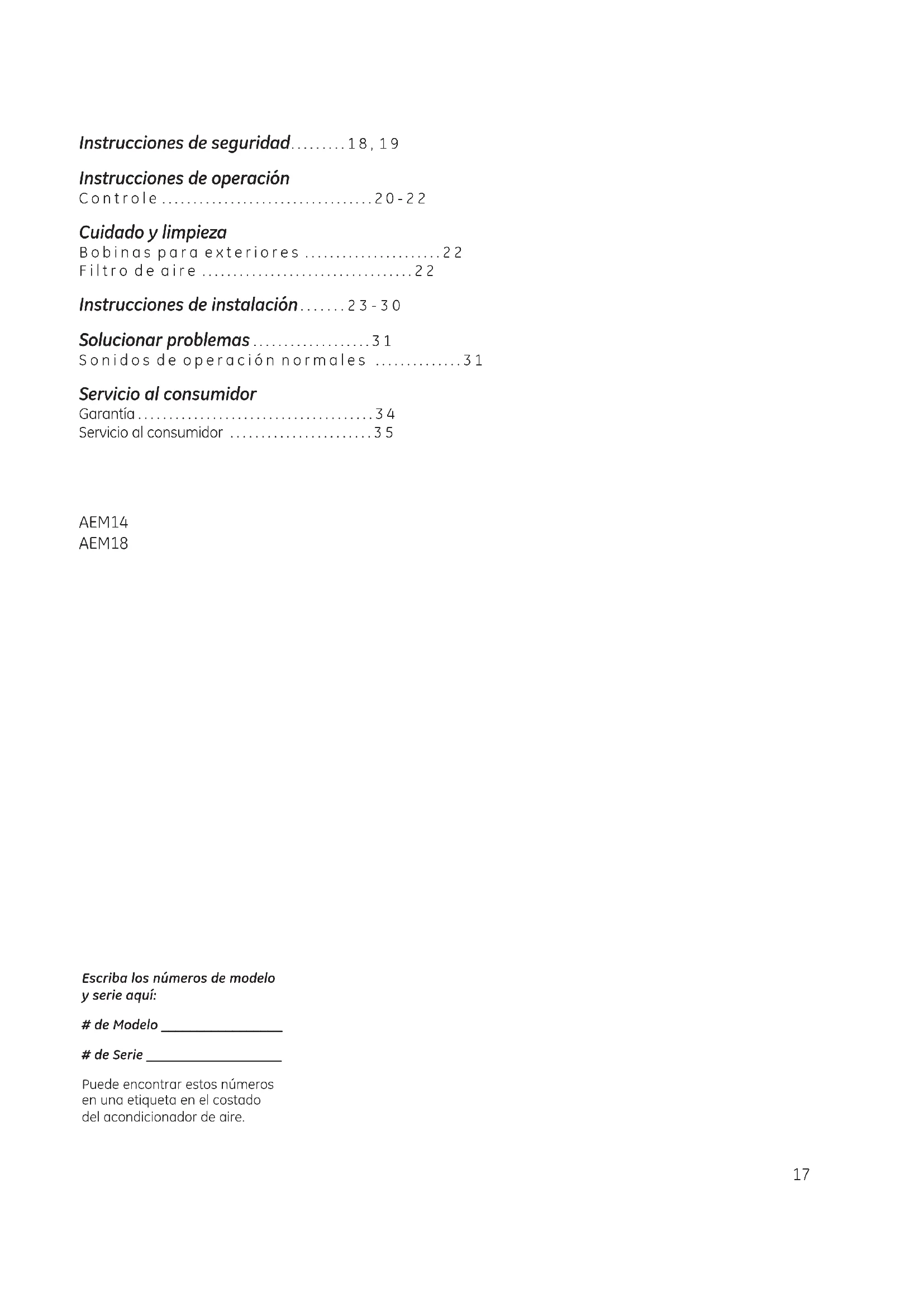 - Servicio al consumidor Escriba los números de modelo y serie aquí: # de Modelo _________________ # de Serie ___________________ Puede encontrar estos números en una etiqueta en el costado del acondicionador de aire. AEM14 AEM1818 INFORMACIÓN IMPORTANTE DE SEGURIDAD. LEA TODAS LAS INSTRUCCIONES ANTES DE USAR. Por su seguridad, se debe seguir la información en este manual para minimizar el riesgo de incendios, descargas eléctricas o lesiones personales. Use este electrodoméstico solamente para el propósito determinado según se describe en el Manual del propietario. Este acondicionador de aire debe instalarse correctamente de acuerdo con las Instrucciones de instalación antes de su uso. Nunca desenchufe su acondicionador de aire tirando del cable eléctrico. Siempre agarre firmemente el enchufe y tire de él directamente hacia afuera. Reemplace inmediatamente todos los cables eléctricos que se hayan pelado o que se hayan dañado de alguna otra manera. Un cable de corriente dañado no debe repararse, sino que debe ser sustituido por uno nuevo que se adquiera del fabricante. No use un cable eléctrico que muestre evidencias de deterioro, o daños de abrasión en su superficie en alguno de sus extremos. Apague la unidad y desenchufe su acondicionador de aire antes de limpiar. GE no está no apoya que se le proporcione ningún servicio al acondicionador de aire. Vehementemente recomendamos que usted no intente proporcionar servicio al acondicionador de aire usted mismo. Por su seguridad…no almacene ni use materiales combustibles, gasolina u otros vapores o líquidos inflamables en la proximidad de éste o algún otro electrodoméstico. Todos los acondicionadores de aire contiene refrigerantes, los que por Ley Federal deben ser removidos antes de desecharlos. Si usted planea deshacerse de algún producto que contenga refrigerantes, póngase en contacto con la compañía que se encarga de recoger su basura para que le indiquen qué hacer. Si el receptáculo no coincide con el enchufe, un electricista calificado debe reemplazar el receptáculo. Estos sistemas de acondicionadores de aire R410A requieren que los contratistas y técnicos usen herramientas, equipos y estándares de seguridad aprobados para su uso con este refrigerante. NO use equipamiento certificado sólo para refrigerante R22. p. 35