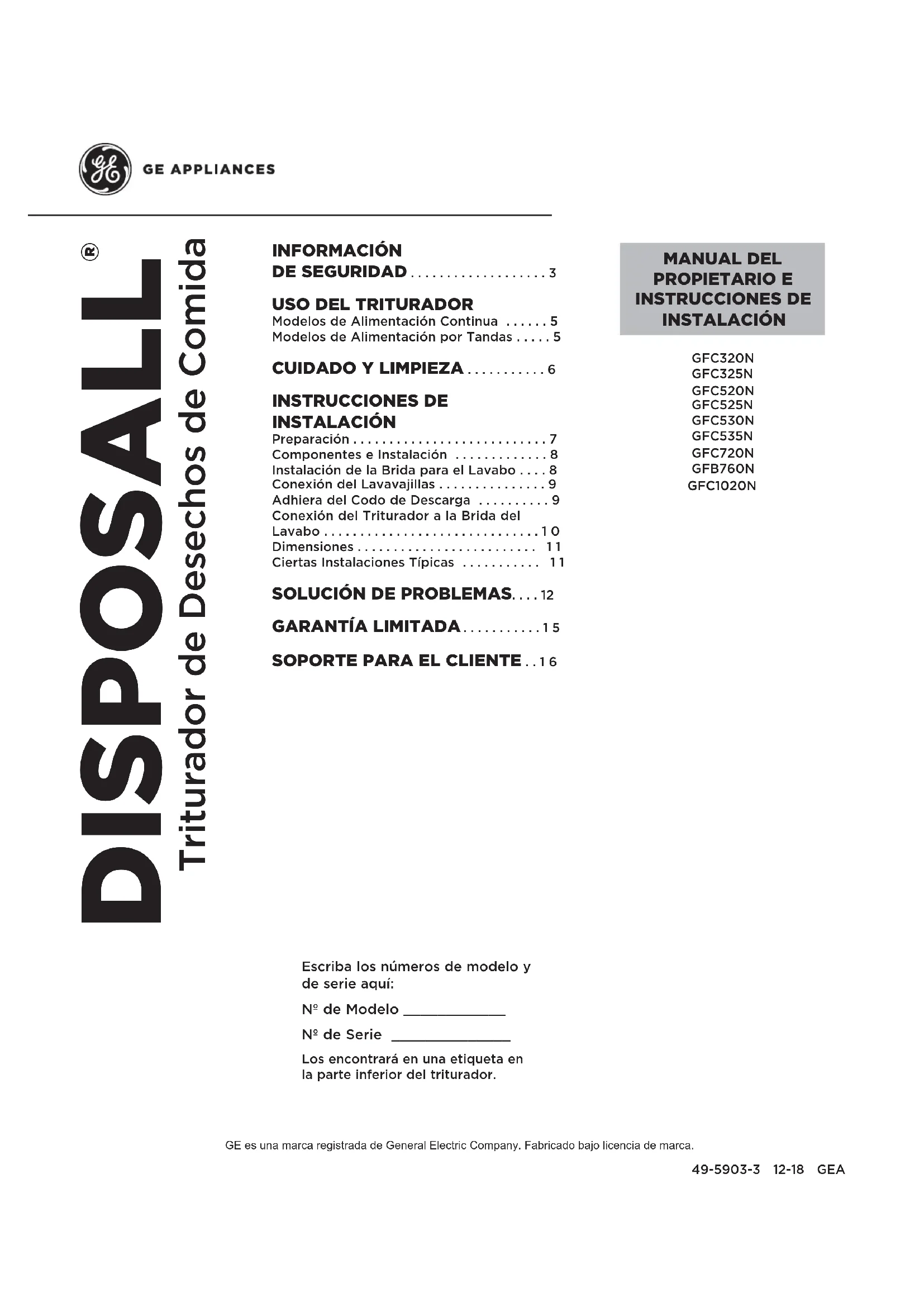 Triturador de Desechos de Comida DISPOSALL ®2 49-5903-3 GRACIAS POR HACER QUE GE APPLIANCES SEA PARTE DE SU HOGAR. Ya sea que haya crecido usando GE Appliances, o que ésta es su primera vez, nos complace tenerlo en la familia. Sentimos orgullo por el nivel de arte, innovación y diseño de cada uno de los electrodomésticos de GE Appliances, y creemos que usted también. Entre otras cosas, el registro de su electrodoméstico asegura que podamos entregarle información importante del producto y detalles de la garantía cuando los necesite. Registre su electrodoméstico GE ahora a través de Internet. Sitios Web y números telefónicos útiles están disponibles en la sección de Soporte para el Consumidor de este Manual del Propietario. También puede enviar una carta en la tarjeta de inscripción preimpresa que se incluye con el material embalado.49-5903-3 3