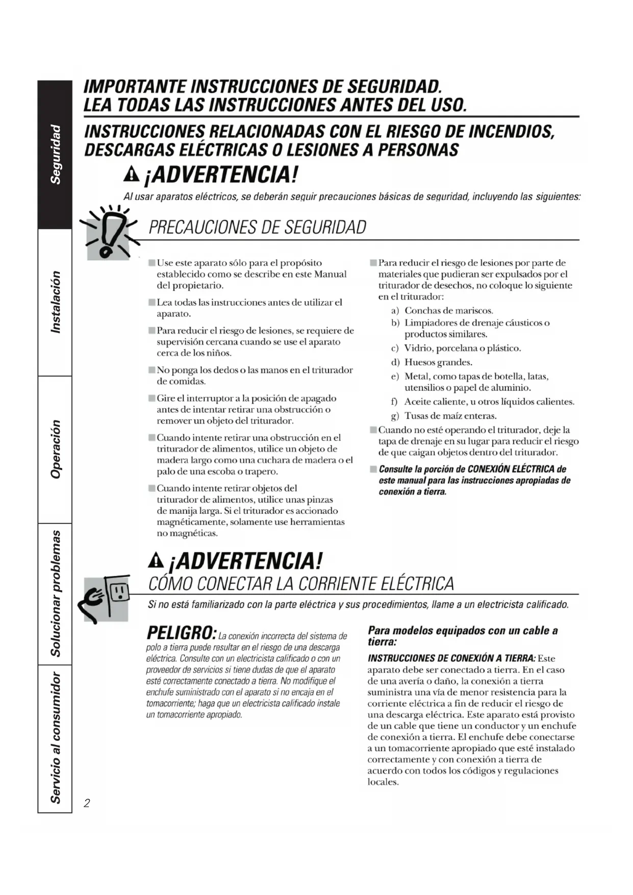 LEA Y SIGA CUIDADOSAMENTE ESTA INFORMACIÓN DE SEGURIDAD. C. Utilice un conectador de alivio de presión de la abrazadera del cable donde el cable de corriente entra al triturador.Si está conectando el triturador directamente a la corriente de la casa:INSTRUCCIONES DE CONEXIÓN A TIERRA: Este aparato se debe conectar a un sistema de cableado permanente, metálico conectado a tierra, o se debe correr un conductor de conexión a tierra para equipos con los conductores del circuito y conectarse al terminal de conexión a tierra para equipos o al conductor en el aparato.A. Si utiliza un cable BX: 1. Estos productos están diseñados para uso doméstico. 2. Conecte el cable blanco al conductor blanco del triturador con una tuerca para alambre. Conecte el cable negro al conductor negro del triturador con una tuerca para alambre. Conecte el cable a tierra sin forro al tornillo de conexión a tierra. El cable de conexión a tierra debe sujetarse y sostenerse con un liberador de tensión. 3. No use un conducto rígido para la conexión del cableado. 4. Debe proporcionarse un interruptor de motor aceptable exclusivo para el triturador en el momento de la instalación. El interruptor debe montarse a la vista cerca del triturador o en la abertura del fregadero para el triturador.Si no se utiliza un cable BX, instale un cable por separado de conexión a tierra a una conexión a tierra con able más cercana, utilizando el tornillo en la campana extremo para el cable de conexión a tierra.www.GEAppliances.comNOTA: Al ver el costado del enchufe eléctrico con el dispositivo de conexión a tierra en la parte superior, la hoja izquierda más larga se conecta con el cable identifi cado.Busque el conductor conectado a esta hoja y una ese conductor al cable blanco del triturador.Lado con costuraLiberación de presiónTuerca Botón rojo para reposición Tornillo de conexión a tierra Tuercas del cable Retire la tapa Hacia la corriente de la casa o cable de corriente Fondo del triturador (campana extremo) B. Si su suministro de corriente no incluye un cable de conexión a tierra, debe adquirir uno a menos que se utilice un cable metálico. Conecte rmemente un cable de cobre al tornillo de polo a tierra del triturador y conecte el otro extremo del cable a una conexión a tierra con able. Use solamente abrazaderas de conexión a tierra aprobadas por UL. Si en su casa se utilizan tuberías de plástico, un electricista cali cado debe instalar una conexión a tierra adecuada. Si no está familiarizado con la parte eléctrica y sus procedimientos, llame a un electricista califi cado. Pieza de conexión de la caja HEYCO. NO.304034
