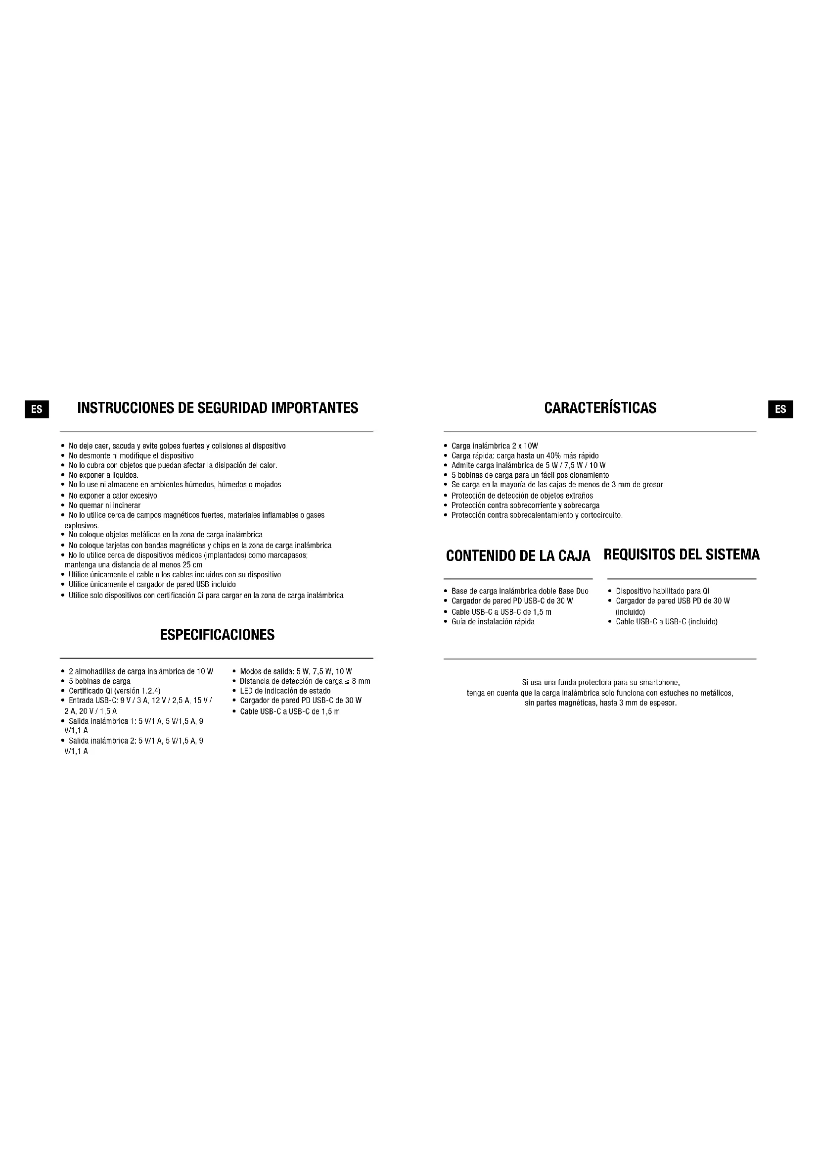 ESPECIFICACIONES Si usa una funda protectora para su smartphone, tenga en cuenta que la carga inalámbrica solo funciona con estuches no metálicos, sin partes magnéticas, hasta 3 mm de espesor. CARACTERÍSTICAS
