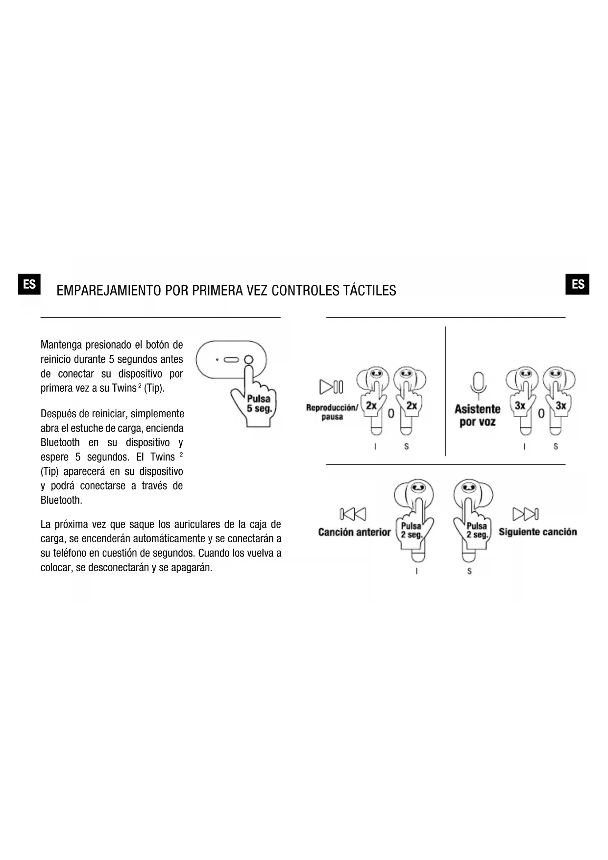 - Rimetti gli auricolari nella custodia di ricarica, chiudila e attendi 10 secondi prima di riprovare. sec.10ES La próxima vez que saque los auriculares de la caja de carga, se encenderán automáticamente y se conectarán a su teléfono en cuestión de segundos. Cuando los vuelva a colocar, se desconectarán y se apagarán. Mantenga presionado el botón de reinicio durante 5 segundos antes de conectar su dispositivo por primera vez a su Twins