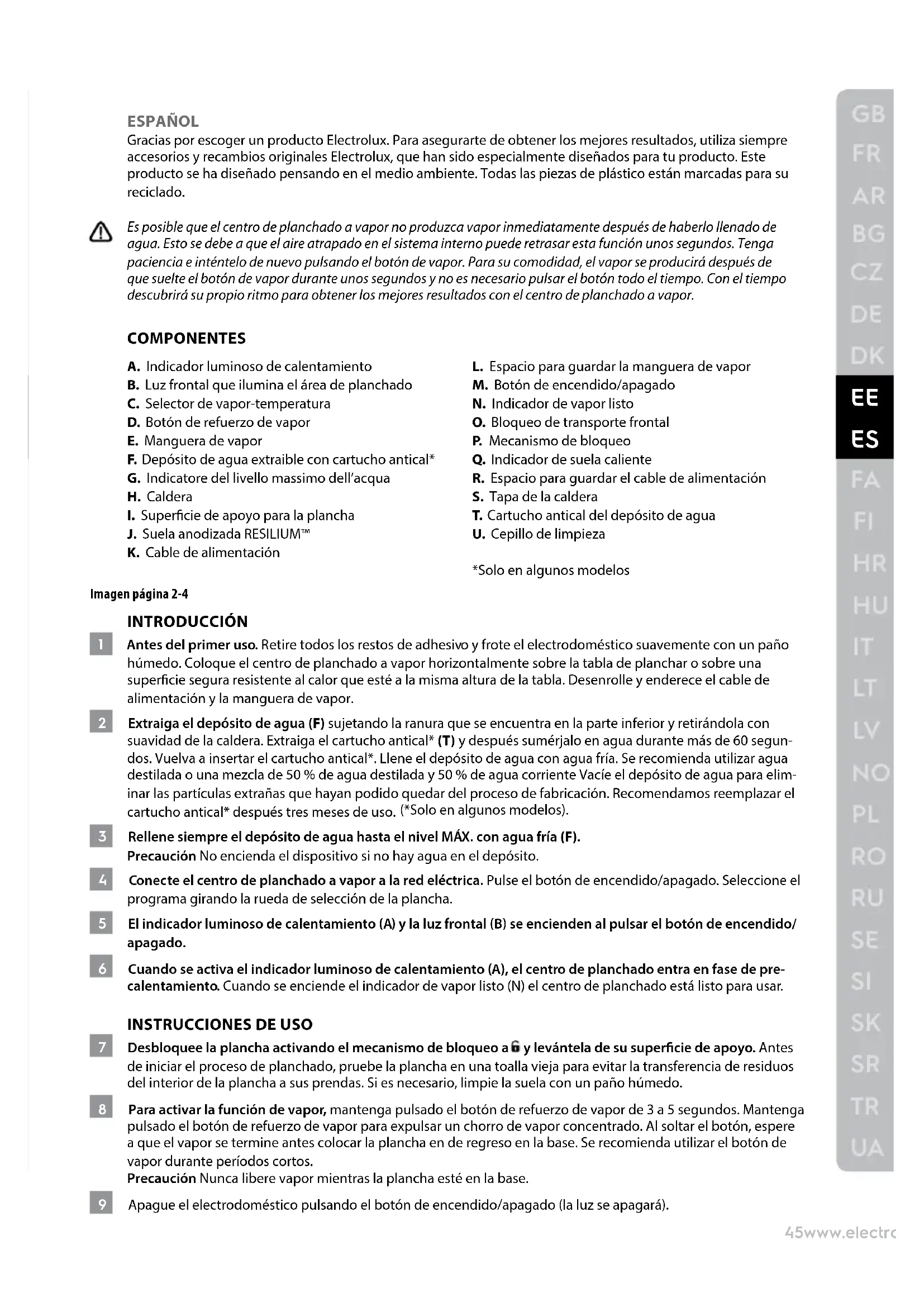 7 Desbloquee la plancha activando el mecanismo de bloqueo a y levántela de su supercie de apoyo. Antes de iniciar el proceso de planchado, pruebe la plancha en una toalla vieja para evitar la transferencia de residuos del interior de la plancha a sus prendas. Si es necesario, limpie la suela con un paño húmedo. 8 Para activar la función de vapor, mantenga pulsado el botón de refuerzo de vapor de 3 a 5 segundos. Mantenga pulsado el botón de refuerzo de vapor para expulsar un chorro de vapor concentrado. Al soltar el botón, espere a que el vapor se termine antes colocar la plancha en de regreso en la base. Se recomienda utilizar el botón de vapor durante períodos cortos. Precaución Nunca libere vapor mientras la plancha esté en la base. 9 Apague el electrodoméstico pulsando el botón de encendido/apagado (la luz se apagará).46 www.electrolux.com 10 Deje siempre que la plancha se enfríe completamente sobre su supercie de apoyo antes de guardarla. Una vez que se haya enfriado, vacíe el depósito de agua. Guarde la plancha del centro de planchado a vapor sobre la supercie de apoyo para la plancha. 11 Cuando haya terminado de utilizar el electrodoméstico, apáguelo pulsando el botón de encendido/apagado. Coloque la plancha sobre la supercie de apoyo y active el mecanismo de bloqueo a para asegurarla. 12 Guarde siempre el cable de alimentación en el guardacable (R) y la manguera de vapor en el espacio para manguera de vapor (L) del centro de planchado a vapor. ¡Advertencia! NUNCA enrolle el cable de alimentación alrededor de la plancha. LIMPIEZA 13 Vuelque la base del centro de planchado hacia un lado de manera que la tapa de la caldera quede hacia arriba. Desenrosque la tapa de la caldera. Dele la vuelta al electrodoméstico sobre el fregadero para vaciar la caldera completamente. 14 Mezcle la proporción de desincrustante y agua indicada para preparar, al menos, 300ml de mezcla desincrustan- te. (Use la proporción recomendada para la mezcla. Si el agua de su domicilio contiene mucha cal (agua muy dura), aumente la proporción del descalcicador). Nota: Se recomienda utilizar el descalcicador EUD5 de Electrolux. Siga las instrucciones sobre la proporción de agua y líquido descalcicador que debe utilizarse indicadas en la botella. Se recomienda limpiar el producto cada dos meses. 15 Retire la mezcla. Llene la caldera con agua pura y, a continuación, vacíela. Repita este paso varias veces hasta que se se elimine la cal y se pueda percibir el aroma del descalcicador. Antes de volver a proceder al montaje, incorpore a la caldera agua pura con un dosicador. LA GARANTÍA NO CUBRE EL DAÑO PROVOCADO POR OBSTRUCCIONES DE CAL. Una vez completada la limpie- za, no mantenga la caldera vacía, deje un poco de agua en su interior (antes de volver a cerrarla). 16 Introduzca el cepillo de limpieza* en la abertura de la caldera y limpie los restos de agua y los residuos de cal sosteniendo el electrodoméstico encima del fregadero. (*Solo en algunos modelos). 17 Limpie el electrodoméstico con un paño ligeramente húmedo. Para eliminar las manchas rebeldes, puede aplicar una pequeña cantidad de limpiador no abrasivo. ¡Disfrute de su nuevo producto Electrolux!