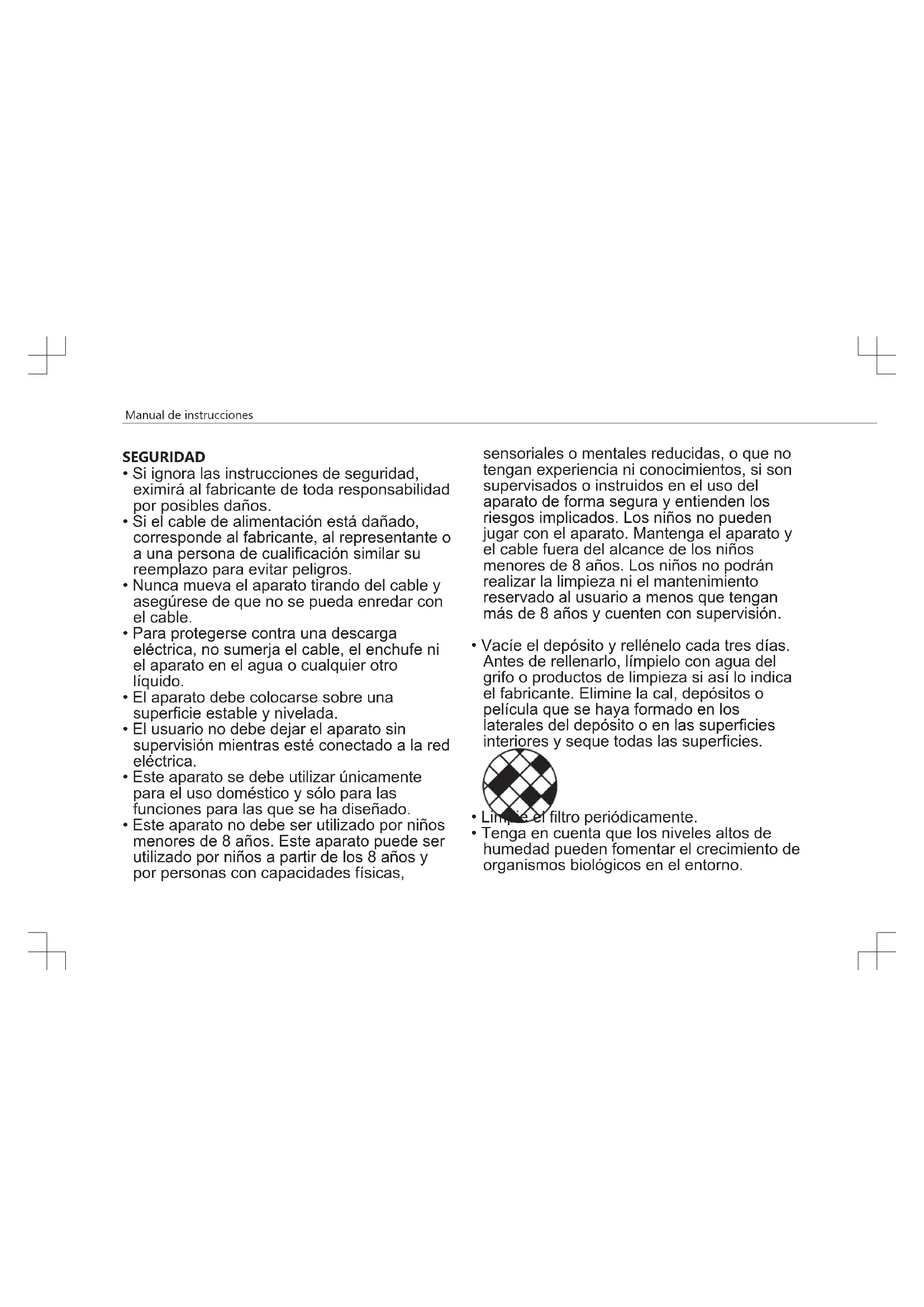 - Este aparato no debe ser utilizado por niños menores de 8 años. Este aparato puede ser utilizado por niños a partir de los 8 años y por personas con capacidades físicas, sensoriales o mentales reducidas, o que no tengan experiencia ni conocimientos, si son supervisados o instruidos en el uso del aparato de forma segura y entienden los riesgos implicados. Los niños no pueden jugar con el aparato. Mantenga el aparato y el cable fuera del alcance de los niños menores de 8 años. Los niños no podrán realizar la limpieza ni el mantenimiento reservado al usuario a menos que tengan más de 8 años y cuenten con supervisión.