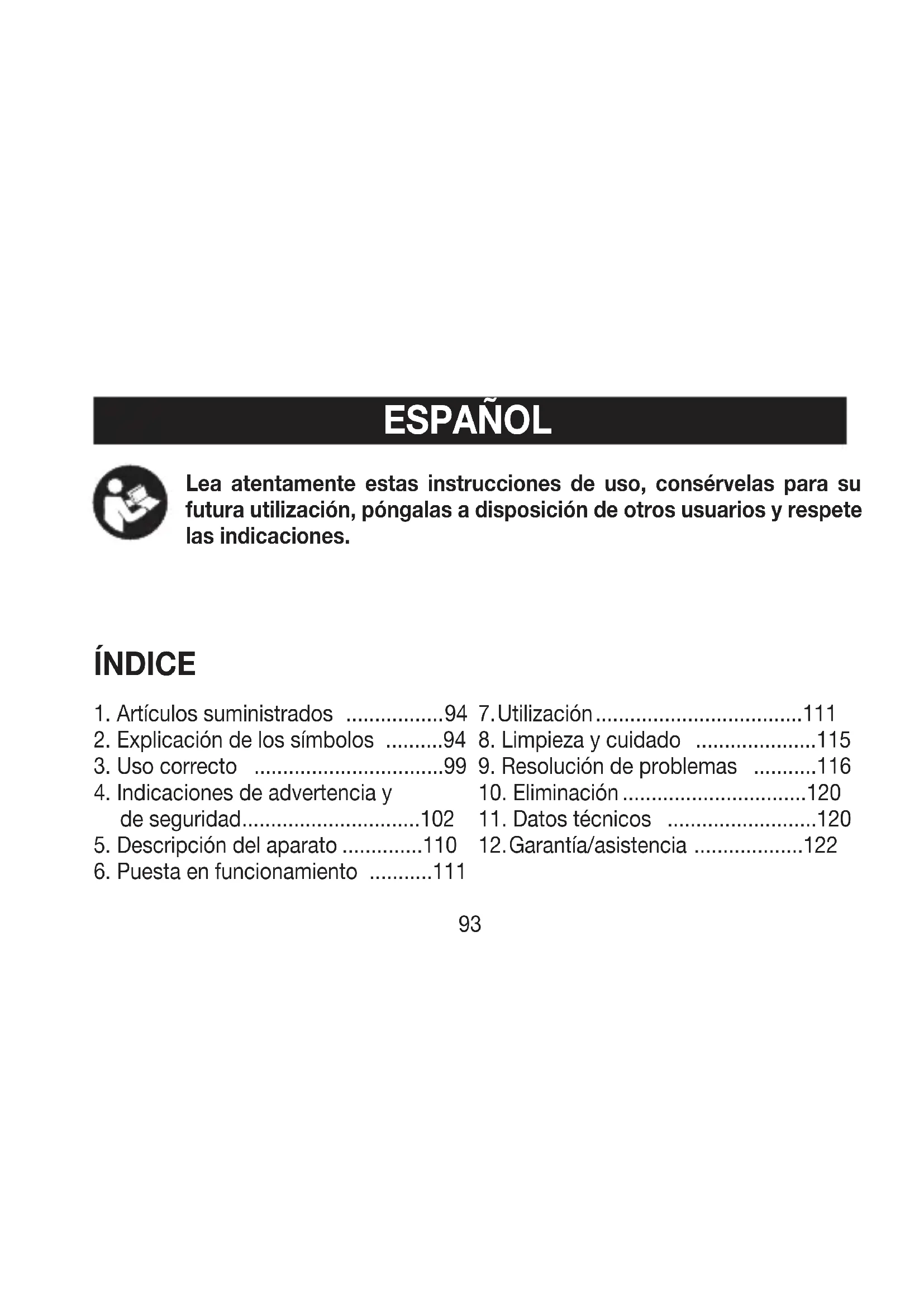 - No utilice el aparato en caso de producirse una irritación permanente de la piel debido a un efecto prolongado del calor en la misma zona.102