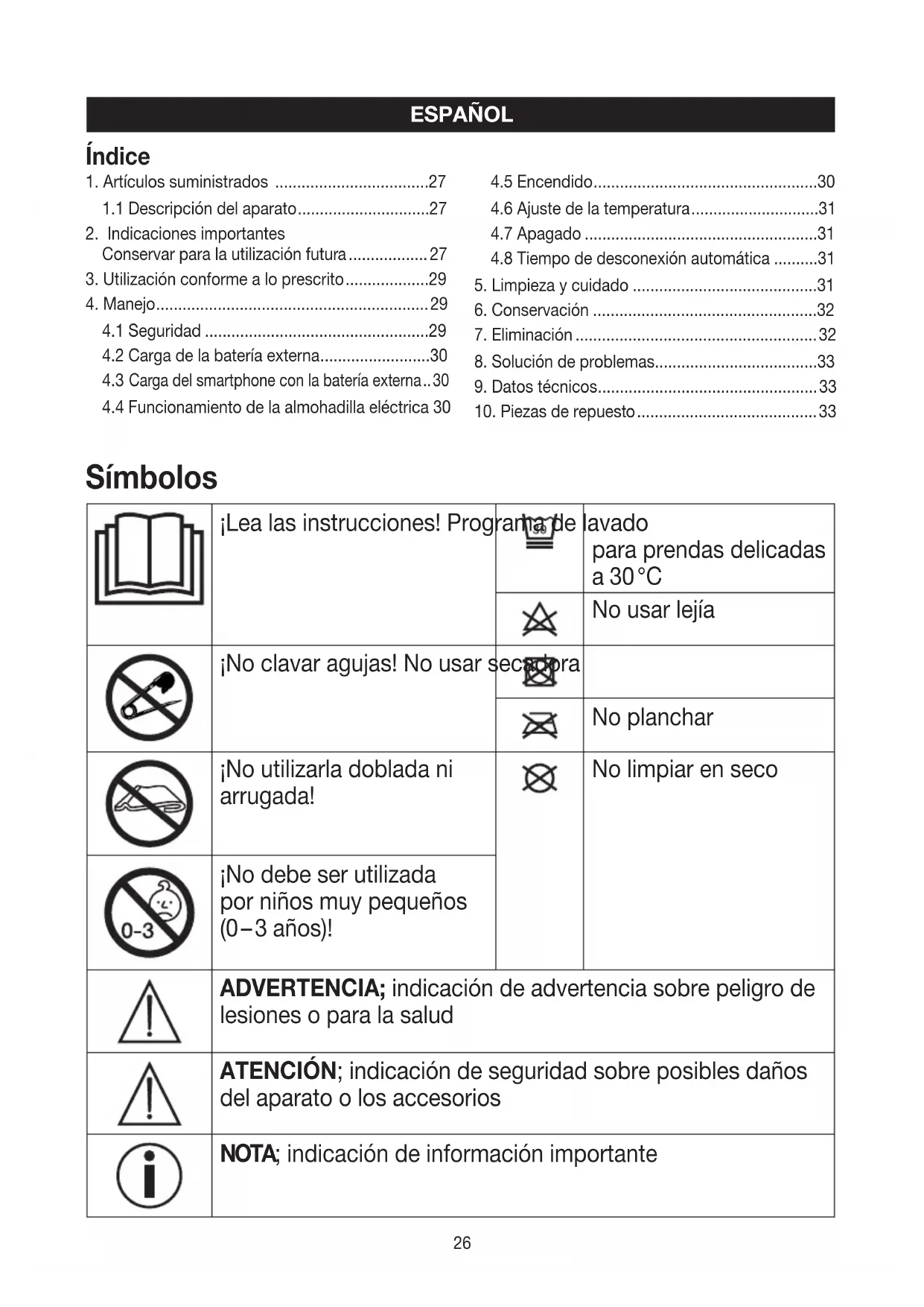 Símbolos ¡Lea las instrucciones! Programa de lavado para prendas delicadas a 30 °C No usar lejía ¡No clavar agujas! No usar secadora No planchar ¡No utilizarla doblada ni arrugada! No limpiar en seco ¡No debe ser utilizada por niños muy pequeños (0 – 3 años)! ADVERTENCIA; indicación de advertencia sobre peligro de lesiones o para la salud ATENCIÓN; indicación de seguridad sobre posibles daños del aparato o los accesorios NOTA; indicación de información importante Índice27
