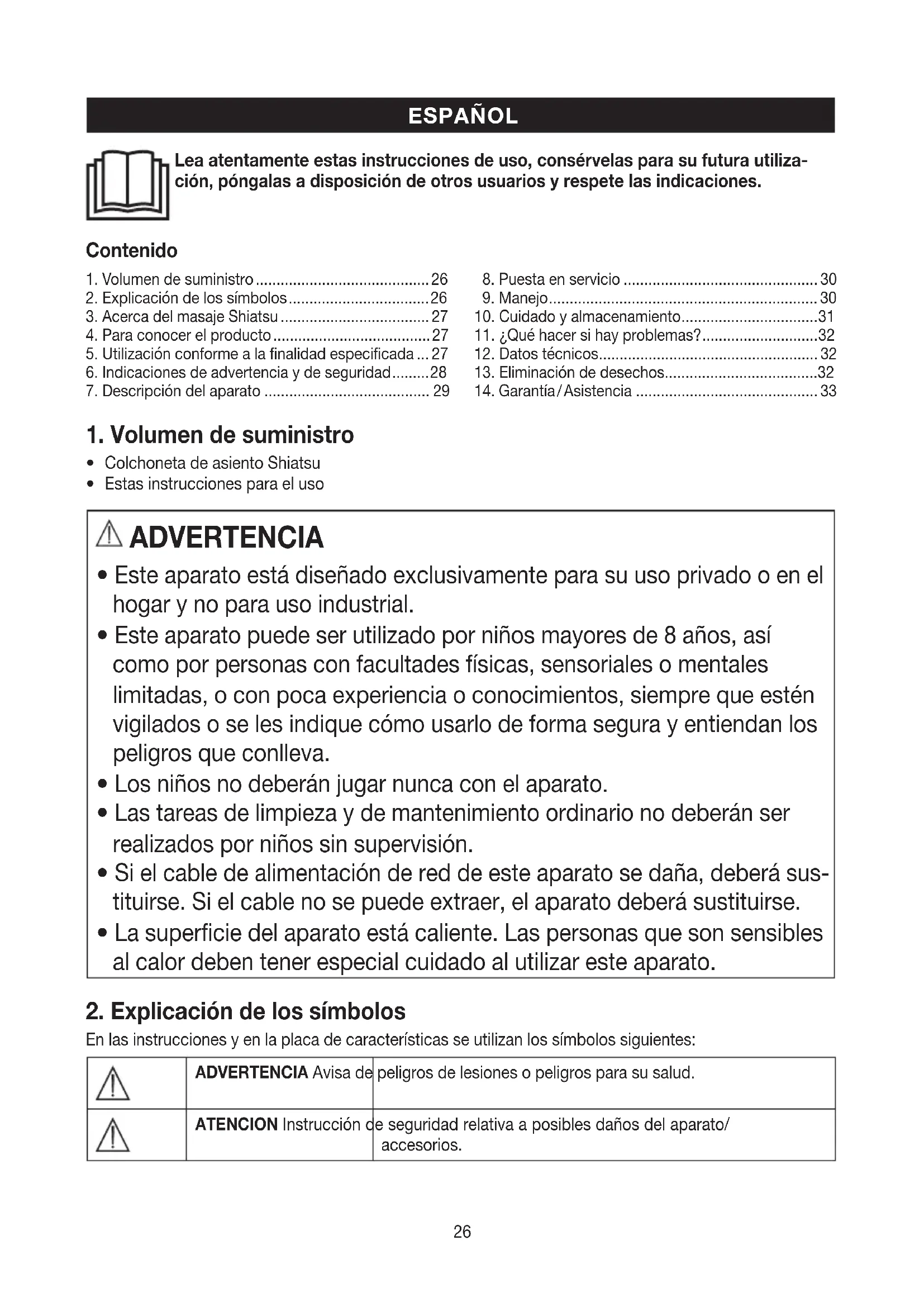 Este aparato está destinado exclusivamente al masaje de la espalda de personas. No puede sustituir un trata- miento médico. No utilice el aparato de masaje si alguna de las advertencias siguientes es aplicable a Usted. ADVERTENCIA