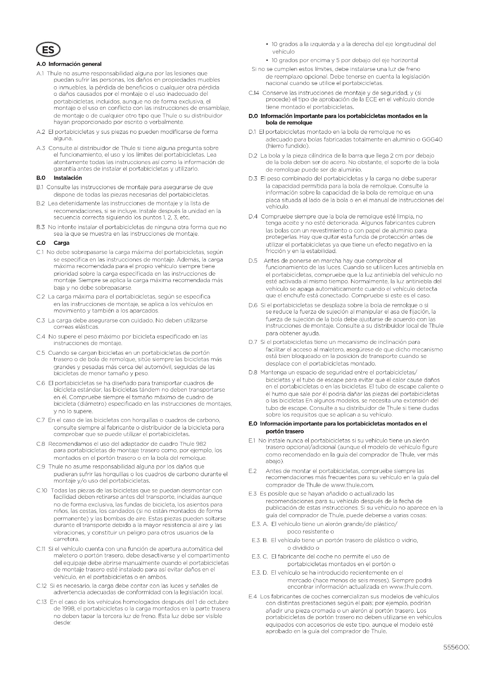 - 10 grados por encima y 5 por debajo del eje horizontal Si no se cumplen estos límites, debe instalarse una luz de freno de reemplazo opcional. Debe tenerse en cuenta la legislación nacional cuando se utilice el portabicicletas. C.14 Conserve las instrucciones de montaje y de seguridad, y (si procede) el tipo de aprobación de la ECE en el vehículo donde tiene montado el portabicicletas. D.0 Información importante para los portabicicletas montados en la bola de remolque D.1 El portabicicletas montado en la bola de remolque no es adecuado para bolas fabricadas totalmente en aluminio o GGG40 (hierro fundido). D.2 La bola y la pieza cilíndrica de la barra que llega 2 cm por debajo de la bola deben ser de acero. No obstante, el soporte de la bola de remolque puede ser de aluminio. D.3 El peso combinado del portabicicletas y la carga no debe superar la capacidad permitida para la bola de remolque. Consulte la información sobre la capacidad de la bola de remolque en una placa situada al lado de la bola o en el manual de instrucciones del vehículo. D.4 Compruebe siempre que la bola de remolque esté limpia, no tenga aceite y no esté deteriorada. Algunos fabricantes cubren las bolas con un revestimiento o con papel de aluminio para protegerlas. Hay que quitar esta funda de protección antes de utilizar el portabicicletas ya que tiene un efecto negativo en la fricción y en la estabilidad. D.5 Antes de ponerse en marcha hay que comprobar el funcionamiento de las luces. Cuando se utilicen luces antiniebla en el portabicicletas, compruebe que la luz antiniebla del vehículo no esté activada al mismo tiempo. Normalmente, la luz antiniebla del vehículo se apaga automáticamente cuando el vehículo detecta que el enchufe está conectado. Compruebe si este es el caso. D.6 Si el portabicicletas se desplaza sobre la bola de remolque o si se reduce la fuerza de sujeción al manipular el asa de fijación, la fuerza de sujeción de la bola debe ajustarse de acuerdo con las instrucciones de montaje. Consulte a su distribuidor local de Thule para obtener ayuda. D.7 Si el portabicicletas tiene un mecanismo de inclinación para facilitar el acceso al maletero, asegúrese de que dicho mecanismo está bien bloqueado en la posición de transporte cuando se desplace con el portabicicletas montado. D.8 Mantenga un espacio de seguridad entre el portabicicletas/ bicicletas y el tubo de escape para evitar que el calor cause daños en el portabicicletas o en las bicicletas. El tubo de escape caliente o el humo que sale por él podría dañar las piezas del portabicicletas o las bicicletas En algunos modelos, se necesita una extensión del tubo de escape. Consulte a su distribuidor de Thule si tiene dudas sobre los requisitos que se aplican a su vehículo. E.0 Información importante para los portabicicletas montados en el portón trasero E.1 No instale nunca el portabicicletas si su vehículo tiene un alerón trasero opcional/adicional (aunque el modelo de vehículo figure como recomendado en la guía del comprador de Thule, ver más abajo). E.2 Antes de montar el portabicicletas, compruebe siempre las recomendaciones más frecuentes para su vehículo en la guía del comprador de Thule de www.thule.com. E.3 Es posible que se hayan añadido o actualizado las recomendaciones para su vehículo después de la fecha de publicación de estas instrucciones. Si su vehículo no aparece en la guía del comprador de Thule, puede deberse a varias cosas: E.3. A. El vehículo tiene un alerón grande/de plástico/ poco resistente o E.3. B. El vehículo tiene un portón trasero de plástico o vidrio, odividido o E.3. C. El fabricante del coche no permite el uso de portabicicletas montados en el portón o E.3. D. El vehículo se ha introducido recientemente en el mercado (hace menos de seis meses). Siempre podrá encontrar información actualizada en www.thule.com. E.4 Los fabricantes de coches comercializan sus modelos de vehículos con distintas prestaciones según el país; por ejemplo, podrían añadir una pieza cromada o un alerón al portón trasero. Los portabicicletas de portón trasero no deben utilizarse en vehículos equipados con accesorios de este tipo, aunque el modelo esté aprobado en la guía del comprador de Thule.6 5560032001 E.5 Thule no asume responsabilidad alguna por los daños o pérdidas causados por la falta de información o la existencia de datos no actualizados en la guía del comprador de Thule como resultado de las diferencias regionales en las prestaciones de los vehículos. E.6 Tenga en cuenta que si se instala un portabicicletas de portón trasero quizás no se pueda utilizar el limpiaparabrisas del portón. Habrá que desactivar la función de limpiaparabrisas (por ejemplo, quitando el fusible; compruebe el manual de instrucciones delvehículo) o quitar el limpiaparabrisas. En los vehículos con funcionamiento automático del limpiaparabrisas trasero, hay que desconectar esta función cuando se instale un portabicicletas de portón trasero. Consulte al concesionario o al taller para obtener ayuda. E.7 Limpie siempre la superficie y los bordes del portón trasero antes de montar el portabicicletas de portón trasero. E.8 Debido al riesgo existente de dañar el vehículo, no está permitida la apertura del maletero si el portabicicletas de portón trasero está montando con las bicicletas. Antes de abrir el maletero, debe haberse descargado el portabicicletas. F.0 Normativas y características de conducción F.1 Compruebe con regularidad las sujeciones de la carga. F.2 El conductor del vehículo es el único responsable de comprobar que el portabicicletas está en buen estado y que tanto el portabicicletas como la carga están debidamente sujetos (aunque lo haya montado una tercera persona). F.3 Cada vez que utilice el portabicicletas, compruebe que está bien sujeto tras conducir una distancia corta (50 km) y a intervalos periódicos a partir de entonces. Si nota algún ruido fuera de lo norm