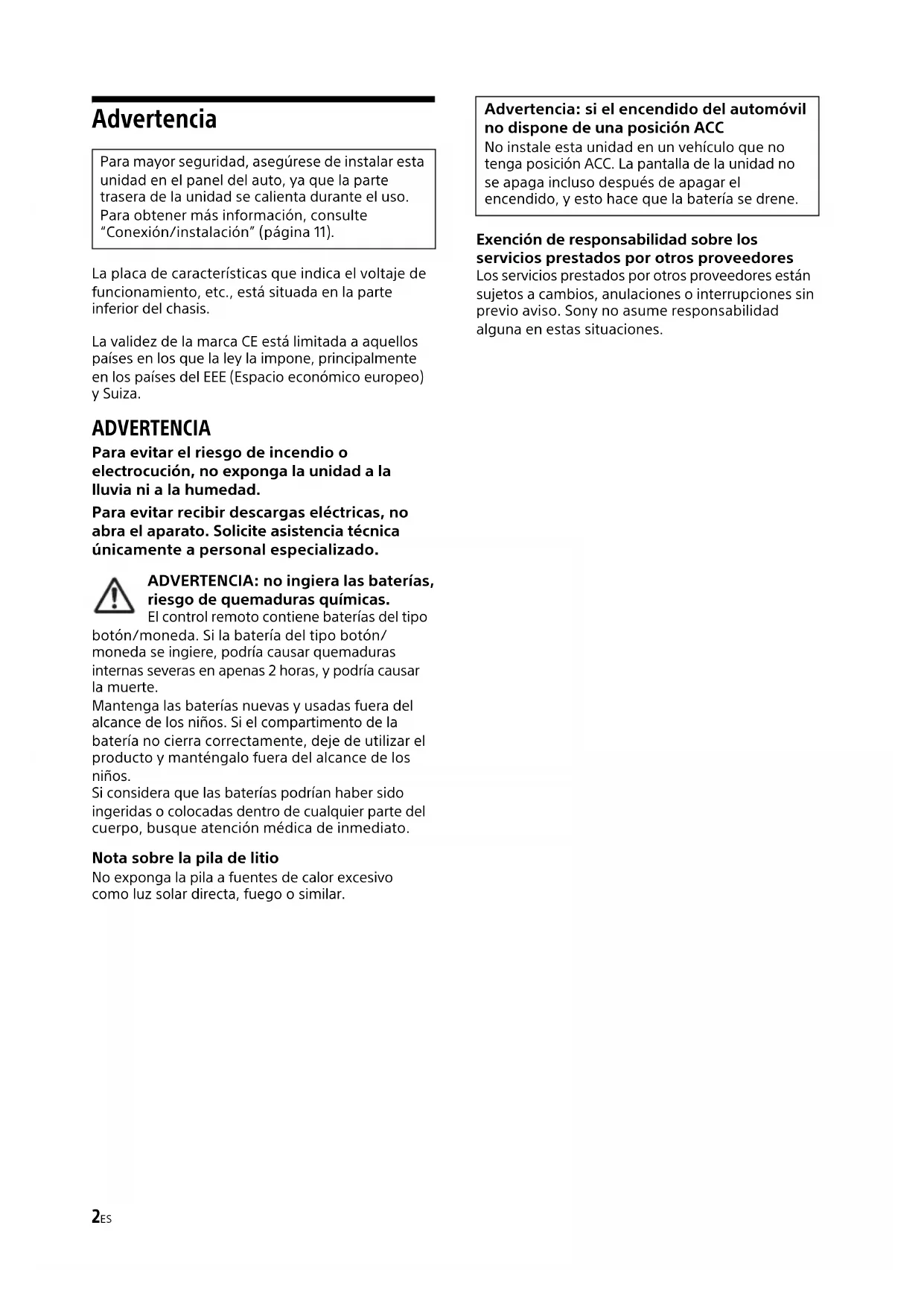 Vers le tableau de bord/la console centralePièces fournies avec la voiture SupportSupport Fusible (10 A)2ES Advertencia La placa de características que indica el voltaje de funcionamiento, etc., está situada en la parte inferior del chasis. La validez de la marca CE está limitada a aquellos países en los que la ley la impone, principalmente en los países del EEE (Espacio económico europeo) y Suiza. ADVERTENCIA Para evitar el riesgo de incendio o electrocución, no exponga la unidad a la lluvia ni a la humedad. Para evitar recibir descargas eléctricas, no abra el aparato. Solicite asistencia técnica únicamente a personal especializado. ADVERTENCIA: no ingiera las baterías, riesgo de quemaduras químicas. El control remoto contiene baterías del tipo botón/moneda. Si la batería del tipo botón/ moneda se ingiere, podría causar quemaduras internas severas en apenas 2 horas, y podría causar la muerte. Mantenga las baterías nuevas y usadas fuera del alcance de los niños. Si el compartimento de la batería no cierra correctamente, deje de utilizar el producto y manténgalo fuera del alcance de los niños. Si considera que las baterías podrían haber sido ingeridas o colocadas dentro de cualquier parte del cuerpo, busque atención médica de inmediato. Nota sobre la pila de litio No exponga la pila a fuentes de calor excesivo como luz solar directa, fuego o similar. Exención de responsabilidad sobre los servicios prestados por otros proveedores Los servicios prestados por otros proveedores están sujetos a cambios, anulaciones o interrupciones sin previo aviso. Sony no asume responsabilidad alguna en estas situaciones. Para mayor seguridad, asegúrese de instalar esta unidad en el panel del auto, ya que la parte trasera de la unidad se calienta durante el uso. Para obtener más información, consulte “Conexión/instalación” (página 11). Advertencia: si el encendido del automóvil no dispone de una posición ACC No instale esta unidad en un vehículo que no tenga posición ACC. La pantalla de la unidad no se apaga incluso después de apagar el encendido, y esto hace que la batería se drene.3ES Precaución EN NINGÚN CASO SONY PODRÁ SER CONSIDERADO RESPONSABLE POR CUALQUIER DAÑO CASUAL, INDIRECTO O CONSECUENTE, NI POR OTROS DAÑOS INCLUIDO, PERO SIN LIMITARSE A, LA PÉRDIDA DE BENEFICIOS, LA PÉRDIDA DE INGRESOS, LA PÉRDIDA DE DATOS, LA PÉRDIDA DE USO DEL PRODUCTO NI DE CUALQUIER MATERIAL ASOCIADO, EL TIEMPO DE