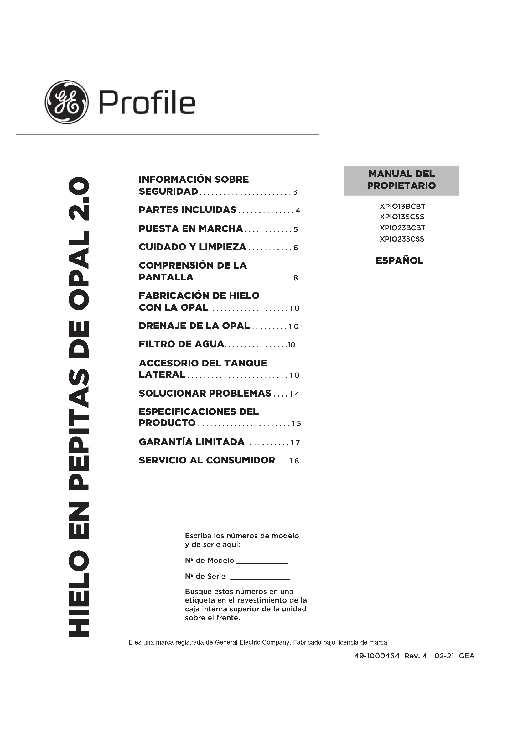 MANUAL DEL PROPIETARIO Escriba los números de modelo y de serie aquí: Nº de Modelo ____________ Nº de Serie ______________ Busque estos números en una etiqueta en el revestimiento de la caja interna superior de la unidad sobre el frente. E es una marca registrada de General Electric Company. Fabricado bajo licencia de marca.2 49-1000464 Rev. 4 GRACIAS POR HACER QUE GE APPLIANCES SEA PARTE DE SU HOGAR. Ya sea que haya crecido usando GE Appliances, o que ésta es su primera vez, nos complace tenerlo en la familia. Sentimos orgullo por el nivel de arte, innovación y diseño de cada uno de los electrodomésticos de GE Appliances, y creemos que usted también. Entre otras cosas, el registro de su electrodoméstico asegura que podamos entregarle información importante del producto y detalles de la garantía cuando los necesite. The Good Ice™ ™49-1000464 Rev. 4 3PRECAUCIÓN A fin de reducir el riesgo de lesión al usar su Opal, siga estas precauciones básicas de seguridad:Ŷ1RUHWLUHQLQJXQDDGYHUWHQFLDGHVHJXULGDGQLHWLTXHWDVGHOproducto de la máquina de hielo.Ŷ5LHVJRDO/HYDQWDUVHUHFRPLHQGDFRQWDUFRQGRVSHUVRQDVSDUDtrasladar e instalar la máquina de hielo, a fin de evitar lesiones.