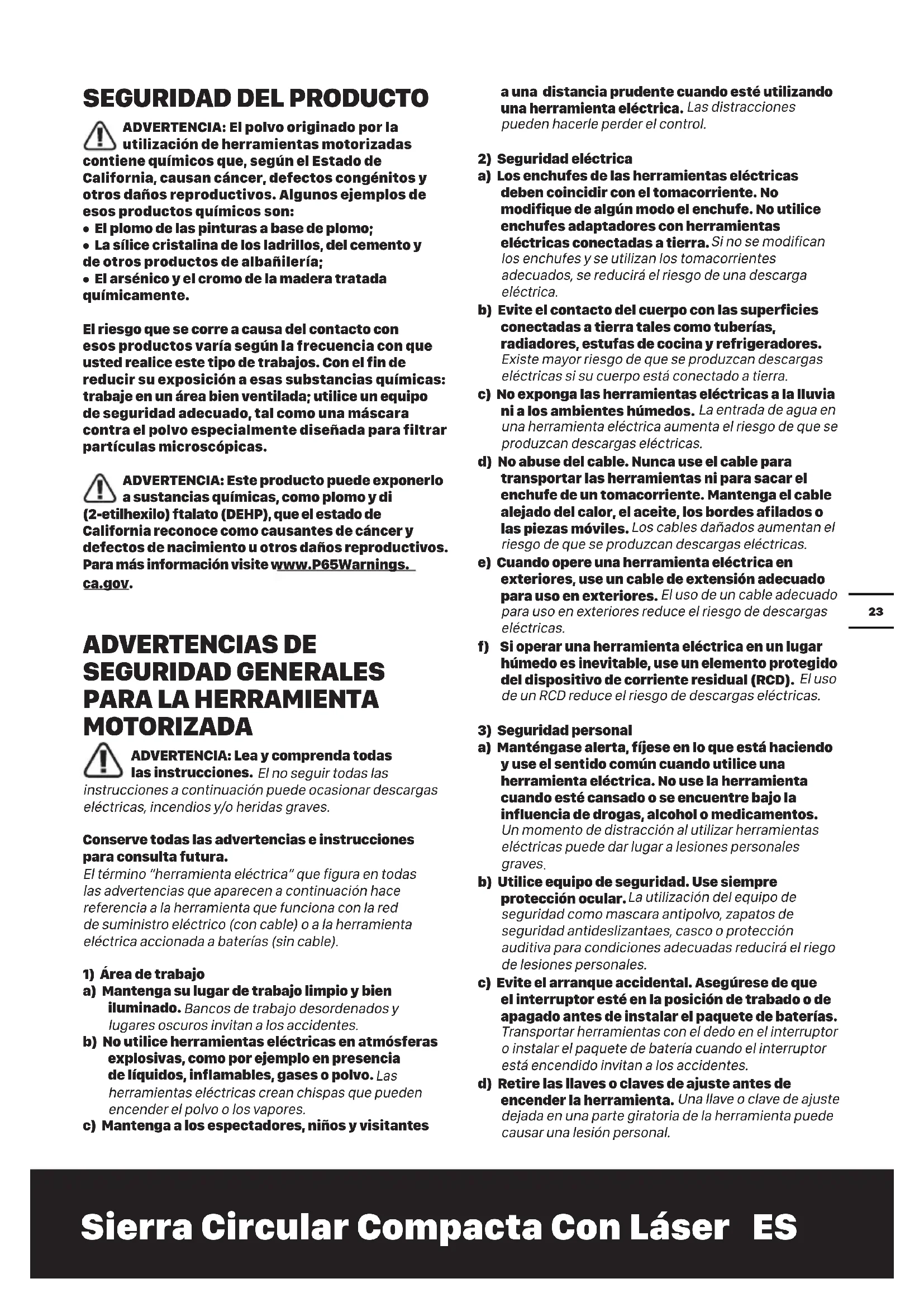 b) Utilice equipo de seguridad. Use siempre protección ocular. La utilización del equipo de seguridad como mascara antipolvo, zapatos de seguridad antideslizantaes, casco o protección auditiva para condiciones adecuadas reducirá el riego de lesiones personales. c) Evite el arranque accidental. Asegúrese de que el interruptor esté en la posición de trabado o de apagado antes de instalar el paquete de baterías. Transportar herramientas con el dedo en el interruptor o instalar el paquete de batería cuando el interruptor está encendido invitan a los accidentes. d) Retire las llaves o claves de ajuste antes de encender la herramienta. Una llave o clave de ajuste dejada en una parte giratoria de la herramienta puede causar una lesión personal.24 Sierra Circular Compacta Con Láser ES e) No intente alcanzar demasiado lejos. Mantenga un apoyo de los pies y un equilibrio adecuados en todo momento. El apoyo de los pies y el equilibrio adecuados permiten un mejor control de la herramienta en situaciones inesperadas. f) Vístase apropiadamente. No se ponga ropa holgada ni joyas. Mantenga su cabello, ropa y guantes alejados de las piezas móviles. La ropa holgada, las joyas o el pelo largo pueden quedar atrapados en las piezas móviles. g) Si se proporcionan dispositivos para la extracción y recolección de polvo, asegúrese que estos estén conectados y utilizados correctamente. El uso de estos dispositivos puede reducir peligros relacionados con el polvo