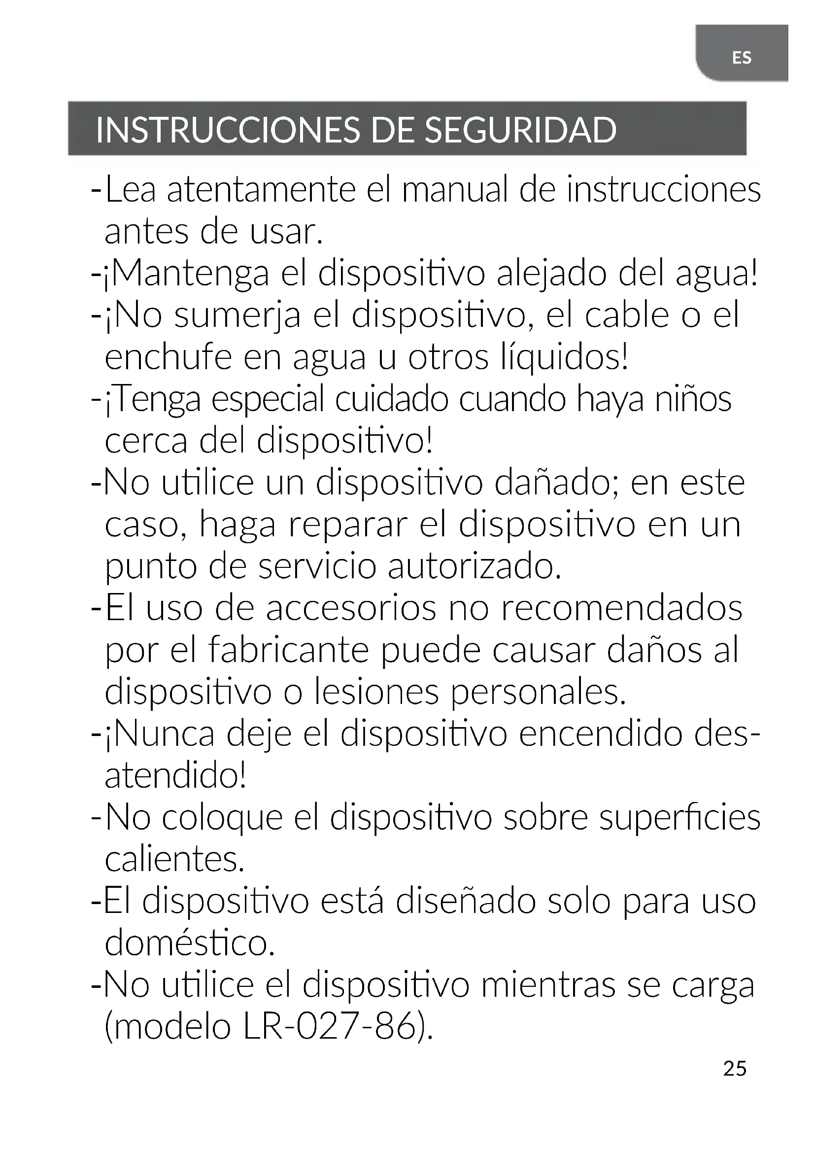 No coloque el disposivo sobre supercies calientes. - El disposivo está diseñado solo para uso domésco. - No ulice el disposivo mientras se carga (modelo LR-027-86).26