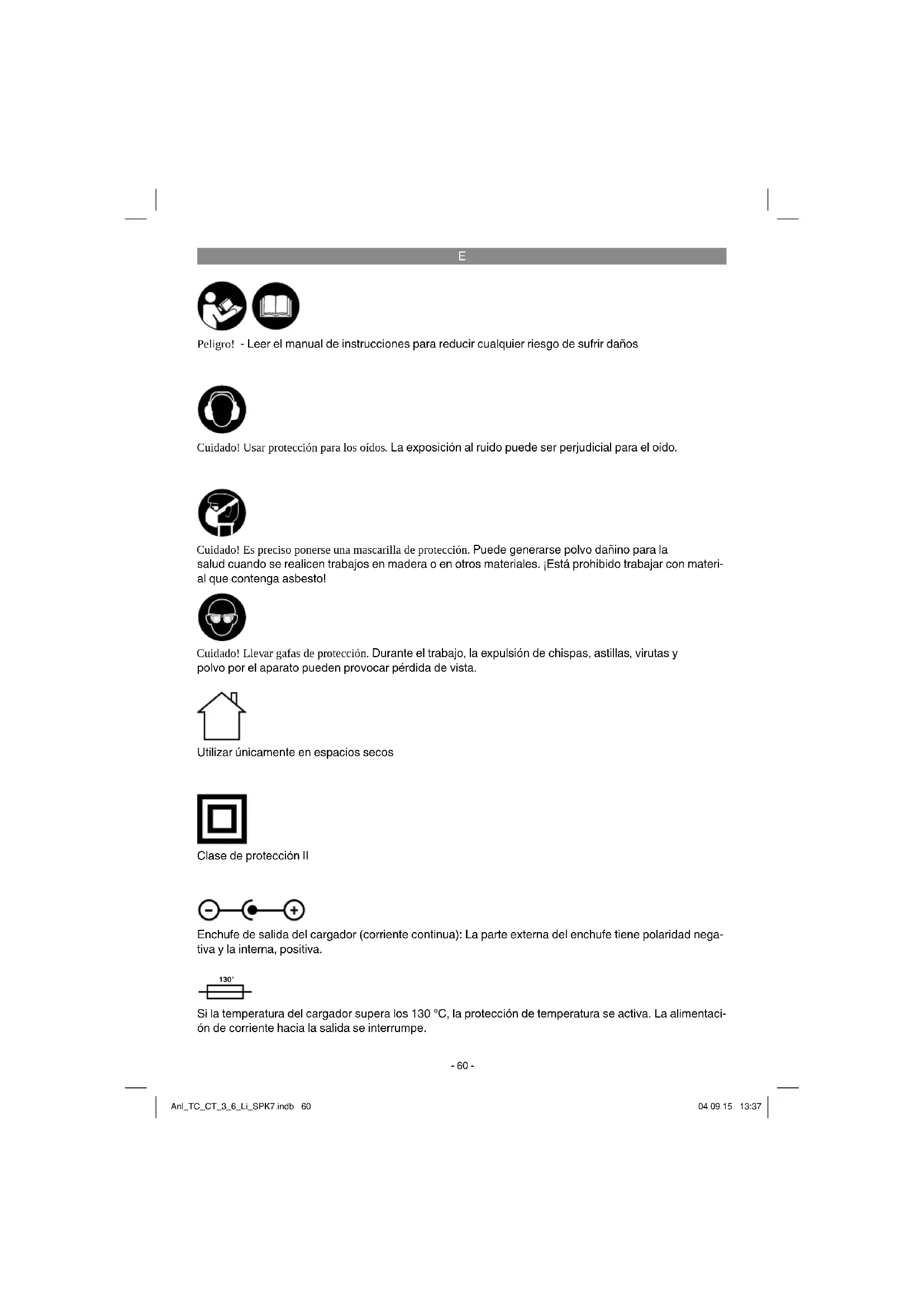 Peligro! - Leer el manual de instrucciones para reducir cualquier riesgo de sufrir daños Cuidado! Usar protección para los oídos. La exposición al ruido puede ser perjudicial para el oído. Cuidado! Llevar gafas de protección. Durante el trabajo, la expulsión de chispas, astillas, virutas y polvo por el aparato pueden provocar pérdida de vista. Cuidado! Es preciso ponerse una mascarilla de protección. Puede generarse polvo dañino para la salud cuando se realicen trabajos en madera o en otros materiales. ¡Está prohibido trabajar con materi- al que contenga asbesto! Utilizar únicamente en espacios secos Clase de protección II Enchufe de salida del cargador (corriente continua): La parte externa del enchufe tiene polaridad nega- tiva y la interna, positiva. 130° Si la temperatura del cargador supera los 130 °C, la protección de temperatura se activa. La alimentaci- ón de corriente hacia la salida se interrumpe. Anl_TC_CT_3_6_Li_SPK7.indb 60Anl_TC_CT_3_6_Li_SPK7.indb 60 04.09.15 13:3704.09.15 13:37E