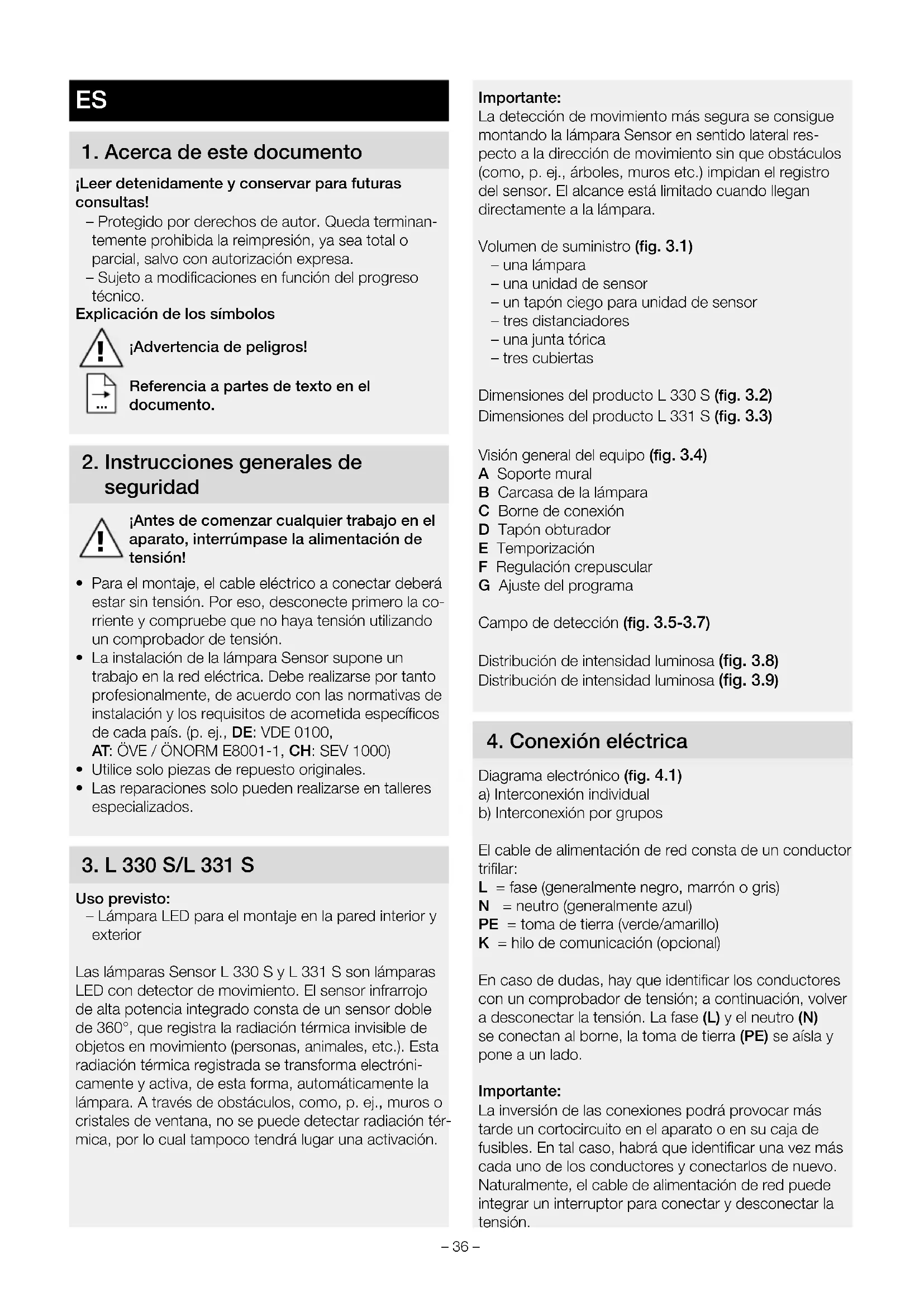 Uso previsto: – Lámpara LED para el montaje en la pared interior y exterior Las lámparas Sensor L330 S y L331 S son lámparas LED con detector de movimiento. El sensor infrarrojo de alta potencia integrado consta de un sensor doble de 360°, que registra la radiación térmica invisible de objetos en movimiento (personas, animales, etc.). Esta radiación térmica registrada se transforma electróni- camente y activa, de esta forma, automáticamente la lámpara. A través de obstáculos, como, p. ej., muros o cristales de ventana, no se puede detectar radiación tér- mica, por lo cual tampoco tendrá lugar una activación. Importante: La detección de movimiento más segura se consigue montando la lámpara Sensor en sentido lateral res- pecto a la dirección de movimiento sin que obstáculos (como, p. ej., árboles, muros etc.) impidan el registro del sensor. El alcance está limitado cuando llegan directamente a la lámpara. Volumen de suministro (fig.3.1) – una lámpara – una unidad de sensor – un tapón ciego para unidad de sensor – tres distanciadores – una junta tórica – tres cubiertas Dimensiones del producto L330 S (fig.3.2) Dimensiones del producto L331 S (fig.3.3) Visión general del equipo (fig.3.4) A Soporte mural B Carcasa de la lámpara C Borne de conexión D Tapón obturador E Temporización F Regulación crepuscular G Ajuste del programa Campo de detección (fig.3.5-3.7) Distribución de intensidad luminosa (fig.3.8) Distribución de intensidad luminosa (fig.3.9)