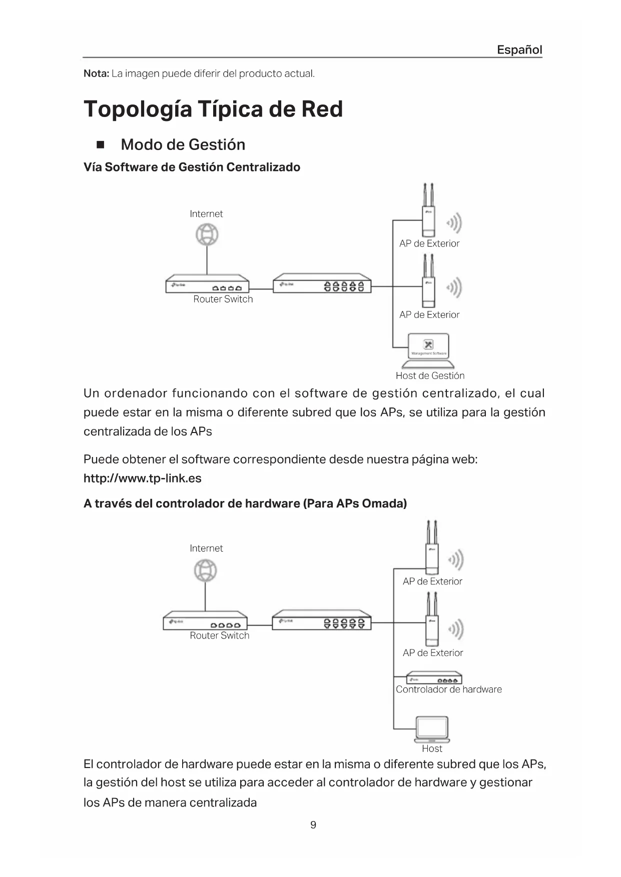 Nota: La imagen puede diferir del producto actual. Topología Típica de Red ■ Modo de Gestión Vía Software de Gestión Centralizado Management Software Un ordenador funcionando con el software de gestión centralizado, el cual puede estar en la misma o diferente subred que los APs, se utiliza para la gestión centralizada de los APs Puede obtener el software correspondiente desde nuestra página web: http://www.tp-link.es A través del controlador de hardware (Para APs Omada) El controlador de hardware puede estar en la misma o diferente subred que los APs, la gestión del host se utiliza para acceder al controlador de hardware y gestionar los APs de manera centralizada Router Switch Internet Host de Gestión AP de Exterior AP de Exterior Router Switch Internet AP de Exterior AP de Exterior Controlador de hardware HostEspañol