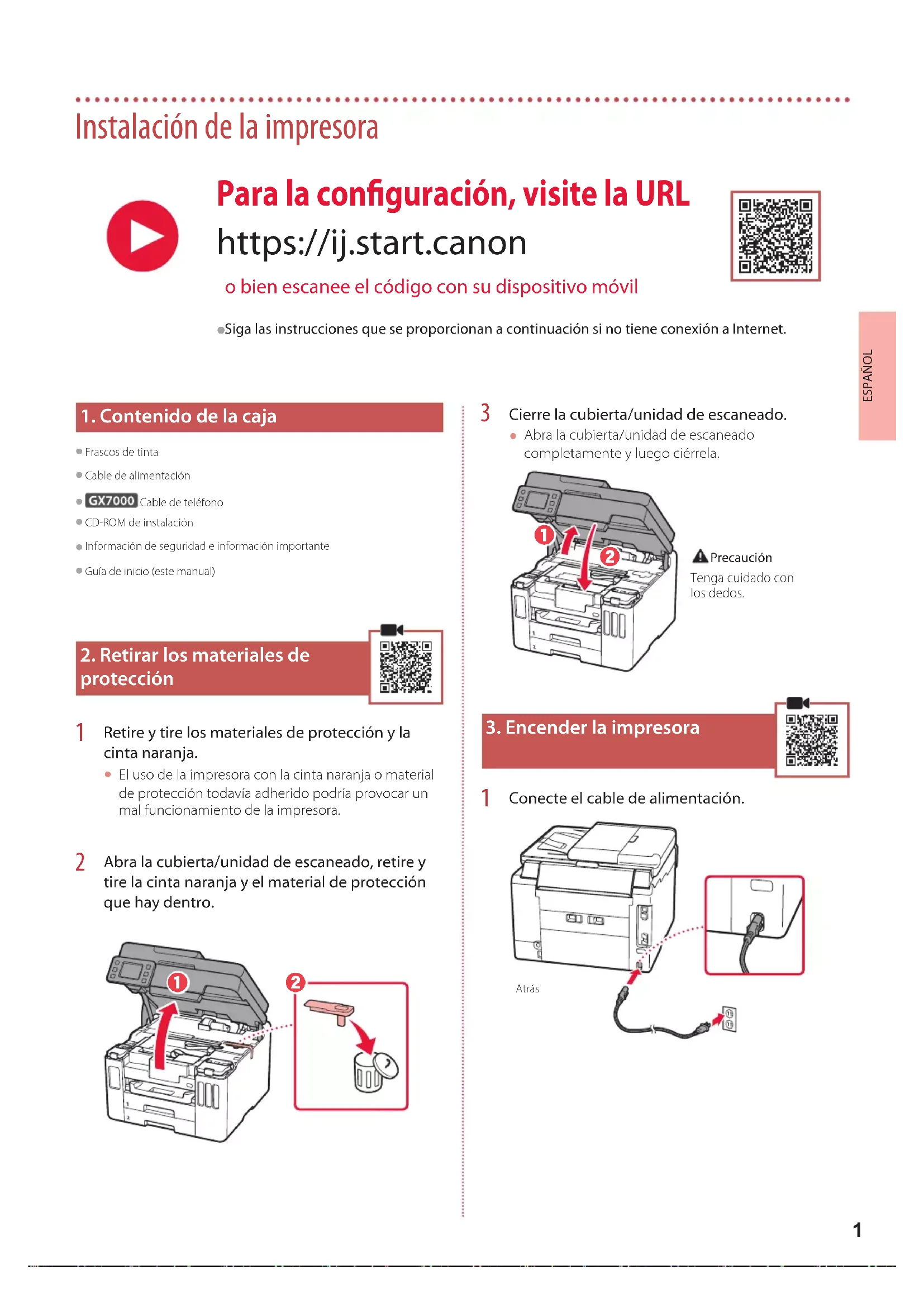 Conecte el cable de alimentación. Atrás Para la configuración, visite la URL https://ij.start.canon o bien escanee el código con su dispositivo móvil