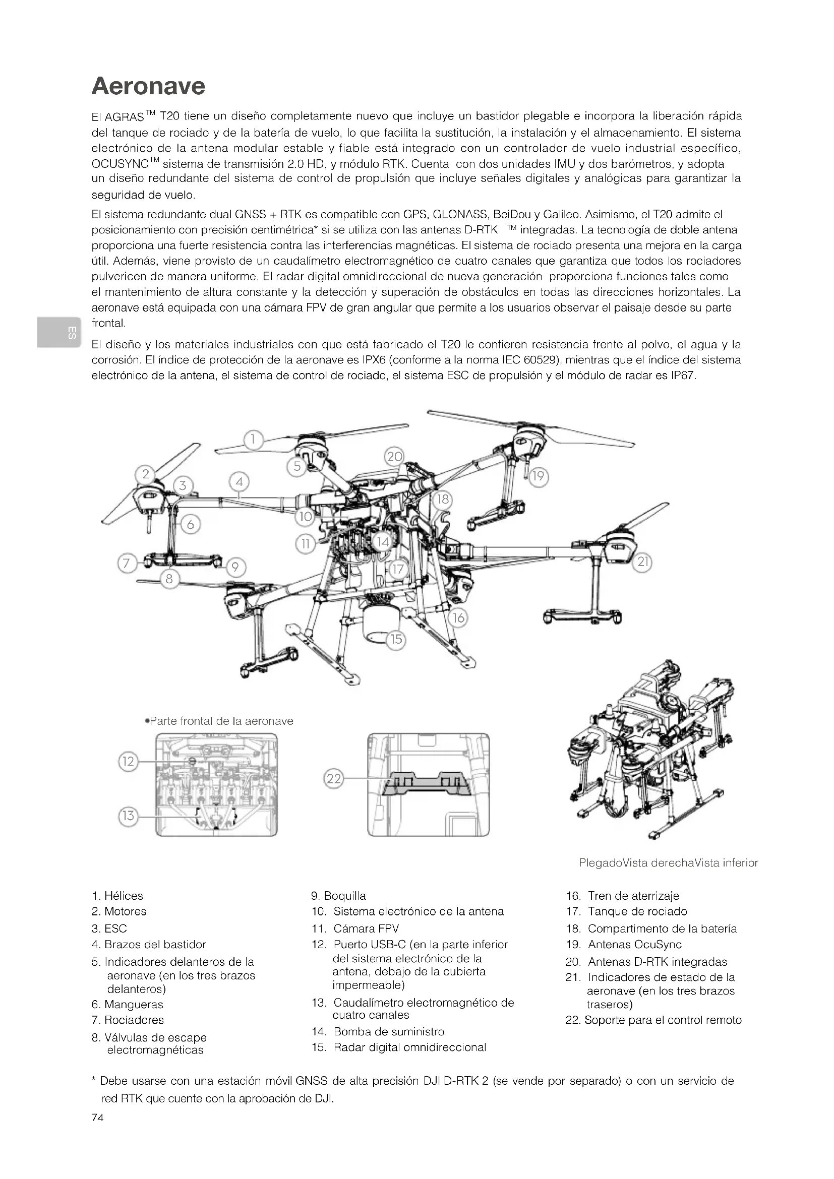 integradas. La tecnología de doble antena proporciona una fuerte resistencia contra las interferencias magnéticas. El sistema de rociado presenta una mejora en la carga útil. Además, viene provisto de un caudalímetro electromagnético de cuatro canales que garantiza que todos los rociadores pulvericen de manera uniforme. El radar digital omnidireccional de nueva generación proporciona funciones tales como el mantenimiento de altura constante y la detección y superación de obstáculos en todas las direcciones horizontales. La aeronave está equipada con una cámara FPV de gran angular que permite a los usuarios observar el paisaje desde su parte frontal. El diseño y los materiales industriales con que está fabricado el T20 le confieren resistencia frente al polvo, el agua y la corrosión. El índice de protección de la aeronave es IPX6 (conforme a la norma IEC 60529), mientras que el índice del sistema electrónico de la antena, el sistema de control de rociado, el sistema ESC de propulsión y el módulo de radar es IP67.