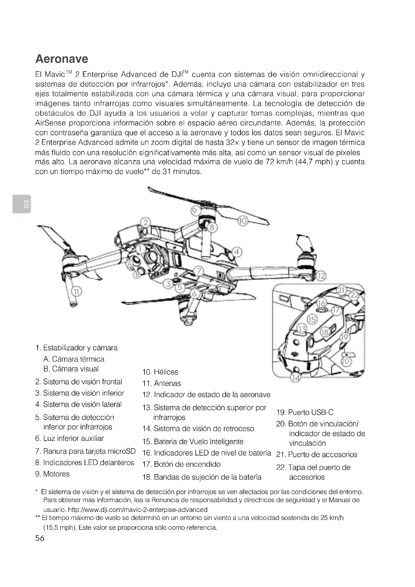 cuenta con sistemas de visión omnidireccional y sistemas de detección por infrarrojos*. Además, incluye una cámara con estabilizador en tres ejes totalmente estabilizada con una cámara térmica y una cámara visual, para proporcionar imágenes tanto infrarrojas como visuales simultáneamente. La tecnología de detección de obstáculos de DJI ayuda a los usuarios a volar y capturar tomas complejas, mientras que AirSense proporciona información sobre el espacio aéreo circundante. Además, la protección con contraseña garantiza que el acceso a la aeronave y todos los datos sean seguros. El Mavic 2 Enterprise Advanced admite un zoom digital de hasta 32× y tiene un sensor de imagen térmica más uido con una resolución signicativamente más alta, así como un sensor visual de píxeles más alto. La aeronave alcanza una velocidad máxima de vuelo de 72 km/h (44,7 mph) y cuenta con un tiempo máximo de vuelo** de 31 minutos.ES