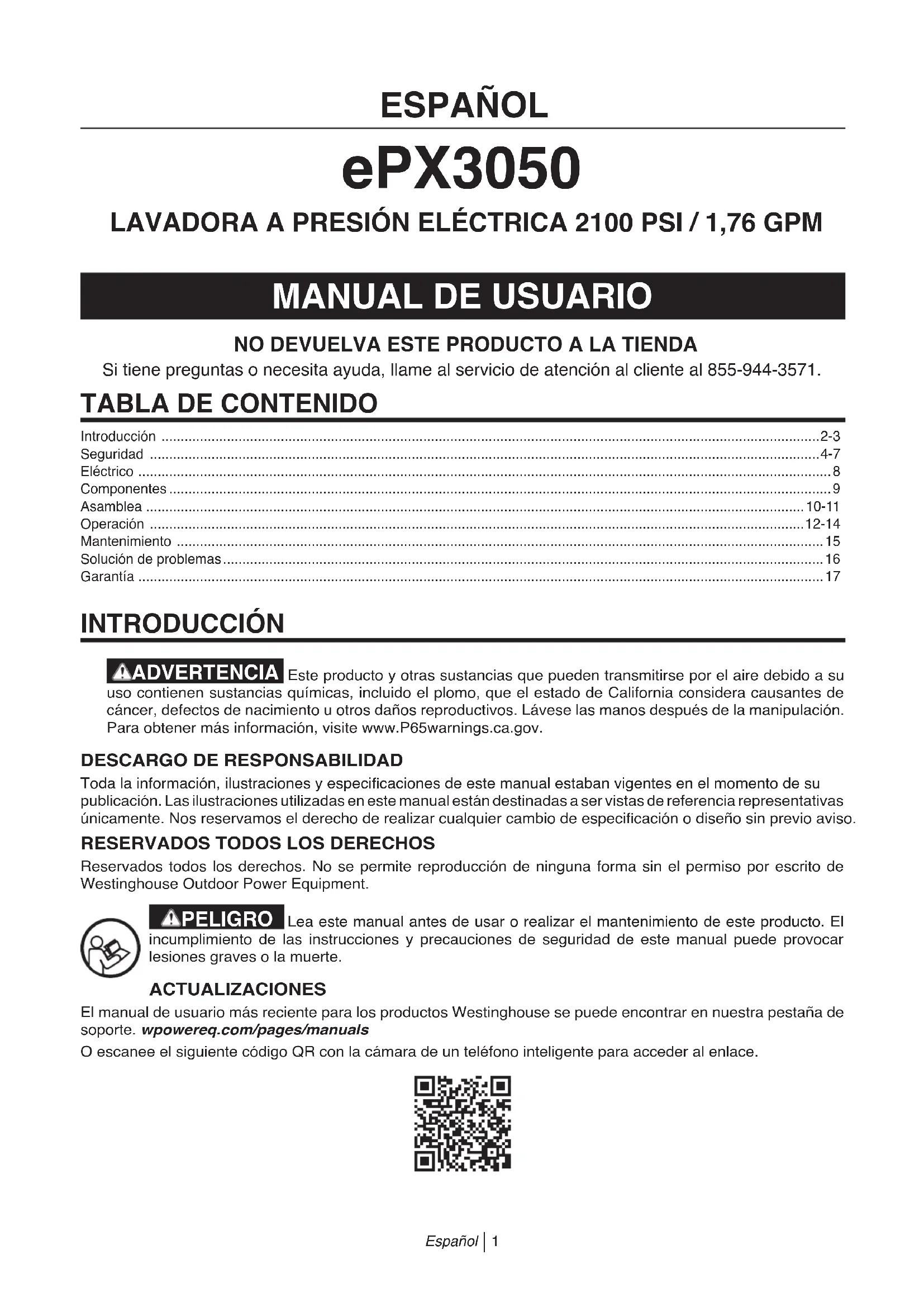 Reservados todos los derechos. No se permite reproducción de ninguna forma sin el permiso por escrito de Westinghouse Outdoor Power Equipment. PELIGRO Lea este manual antes de usar o realizar el mantenimiento de este producto. El incumplimiento de las instrucciones y precauciones de seguridad de este manual puede provocar lesiones graves o la muerte. ACTUALIZACIONES El manual de usuario más reciente para los productos Westinghouse se puede encontrar en nuestra pestaña de soporte. wpowereq.com/pages/manualsO escanee el siguiente código QR con la cámara de un teléfono inteligente para acceder al enlace. ESPAÑOL ePX3050 LAVADORA A PRESIÓN ELÉCTRICA 2100 PSI / 1,76 GPM NO DEVUELVA ESTE PRODUCTO A LA TIENDA Si tiene preguntas o necesita ayuda, llame al servicio de atención al cliente al 855-944-3571.