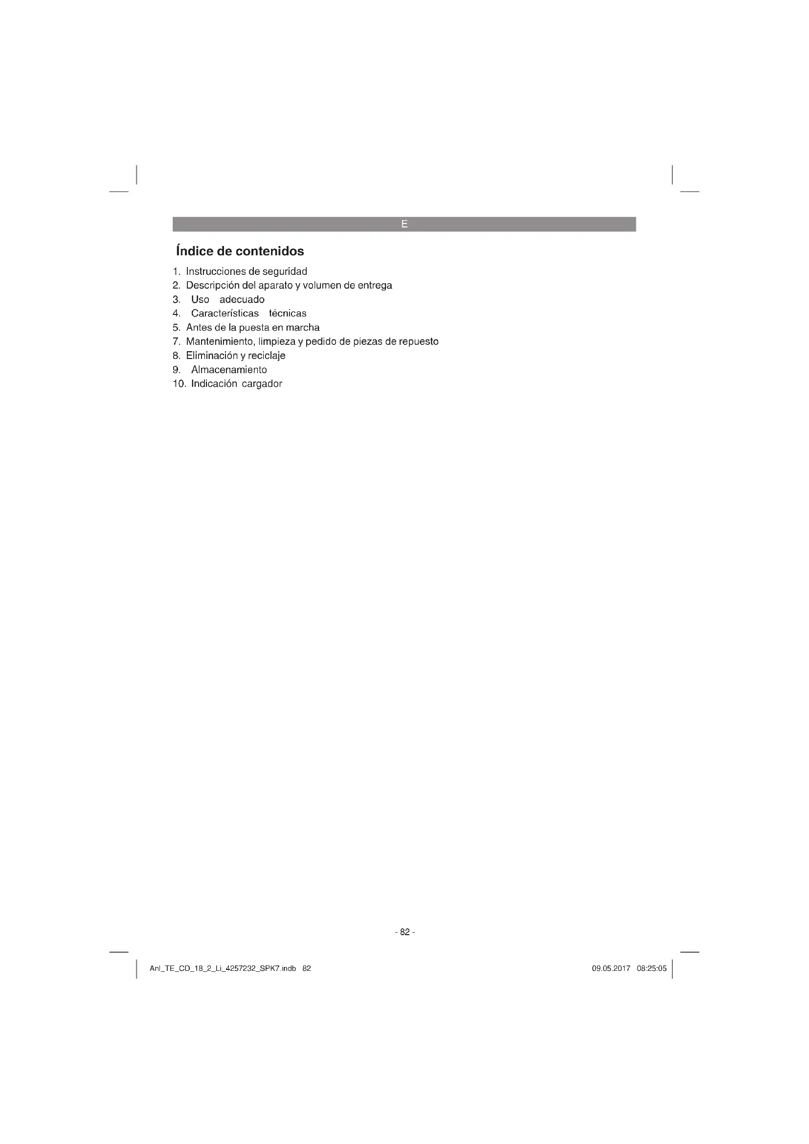 El taladro atornillador a pilas recargables está previsto para atornillar y desatornillar tornillos, así como para taladrar en madera, metall y plástico. Utilizar la máquina sólo en los casos que se indi- can explícitamente como de uso adecuado. Cual- quier otro uso no será adecuado. En caso de uso inadecuado, el fabricante no se hace responsable de daños o lesiones de cualquier tipo; el respon- sable es el usuario u operario de la máquina. Tener en consideración que nuestro aparato no está indicado para un uso comercial, industrial o en taller. No asumiremos ningún tipo de garantía cuando se utilice el aparato en zonas industria- les, comerciales o talleres, así como actividades similares. Anl_TE_CD_18_2_Li_4257232_SPK7.indb 84Anl_TE_CD_18_2_Li_4257232_SPK7.indb 84 09.05.2017 08:25:0509.05.2017 08:25:05E