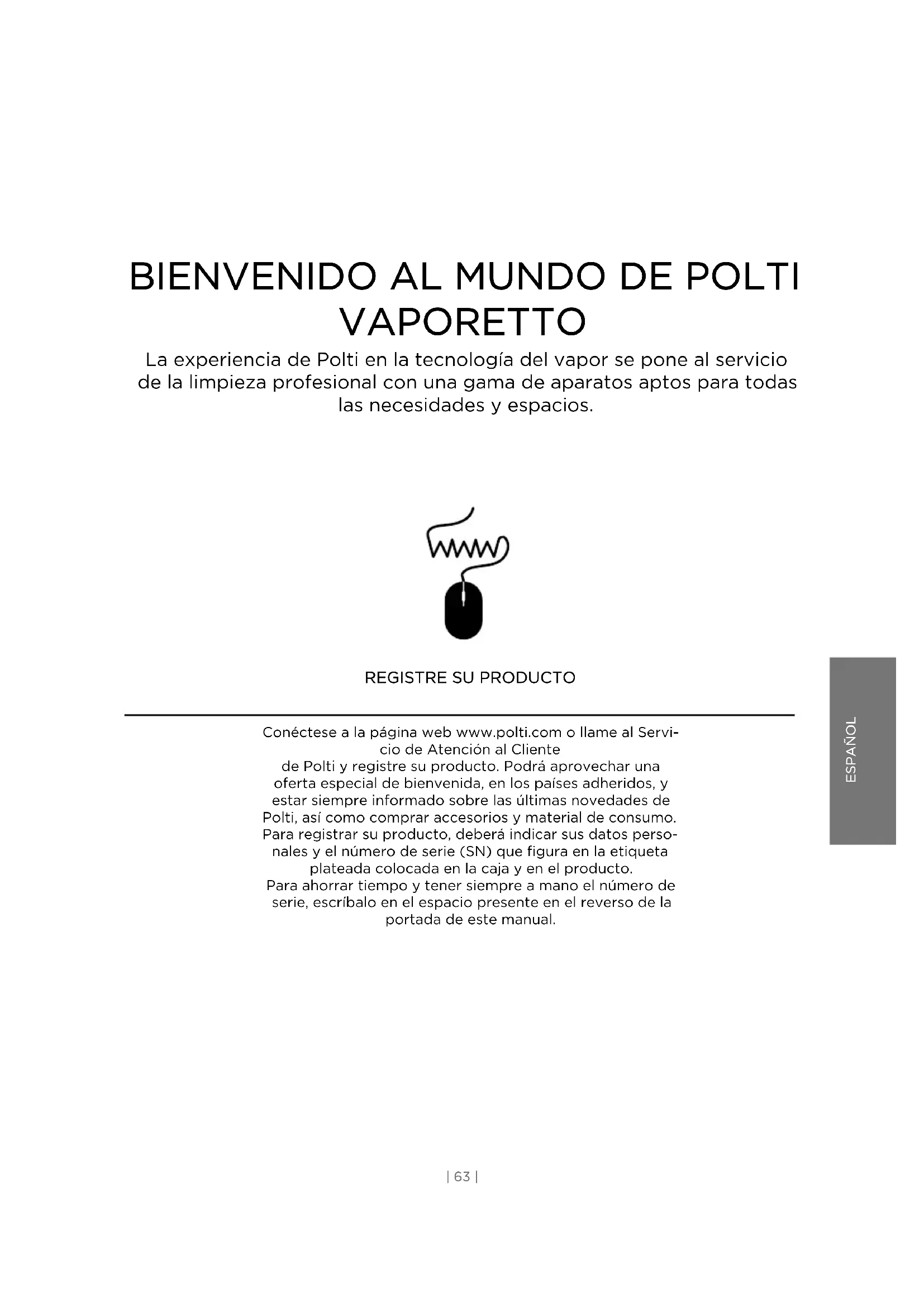 Conéctese a la página web www.polti.com o llame al Servi- cio de Atención al Cliente de Polti y registre su producto. Podrá aprovechar una oferta especial de bienvenida, en los países adheridos, y estar siempre informado sobre las últimas novedades de Polti, así como comprar accesorios y material de consumo. Para registrar su producto, deberá indicar sus datos perso- nales y el número de serie (SN) que figura en la etiqueta plateada colocada en la caja y en el producto. Para ahorrar tiempo y tener siempre a mano el número de serie, escríbalo en el espacio presente en el reverso de la portada de este manual.LEYENDA