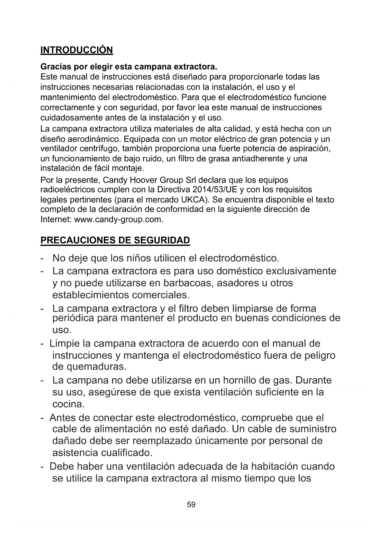 INTRODUCCIÓN Gracias por elegir esta campana extractora. Este manual de instrucciones está diseñado para proporcionarle todas las instrucciones necesarias relacionadas con la instalación, el uso y el mantenimiento del electrodoméstico. Para que el electrodoméstico funcione correctamente y con seguridad, por favor lea este manual de instrucciones cuidadosamente antes de la instalación y el uso. La campana extractora utiliza materiales de alta calidad, y está hecha con un diseño aerodinámico. Equipada con un motor eléctrico de gran potencia y un ventilador centrífugo, también proporciona una fuerte potencia de aspiración, un funcionamiento de bajo ruido, un filtro de grasa antiadherente y una instalación de fácil montaje. Por la presente, Candy Hoover Group Srl declara que los equipos radioeléctricos cumplen con la Directiva 2014/53/UE y con los requisitos legales pertinentes (para el mercado UKCA). Se encuentra disponible el texto completo de la declaración de conformidad en la siguiente dirección de Internet: www.candy-group.com.