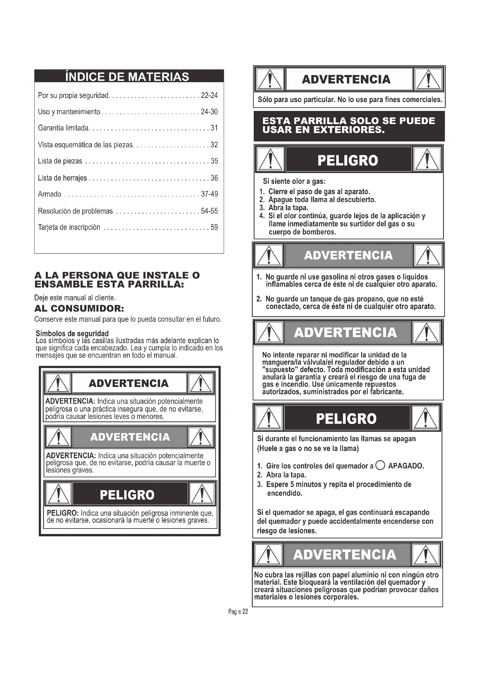 - -55 Tarjeta de inscripción Pag e 23Antes de empezar a ensamblar la parrilla y cocinar, lea y siga todas las indicaciones de seguridad, las instrucciones de ensamblado y las instrucciones de uso y de cuidado Ciertas pueden tener bordes cortantes. Si es necesario, use guantes protectores. ADVERTENCIA PROPOSICION 65 DEL ESTADO DE CALIFORNIA 1. En el estado de California se sabe que los subproductos de la combustión, que se producen al usar este producto, contienen substancias químicas que causan cáncer, defectos congénitos u otras lesiones al aparato reproductor.2. Este producto contiene substancias químicas, incluyendo el plomo y compuestos de plomo, que en el estado de California se sabe que las causan cáncer, defectos congénitos u otras lesiones al aparato reproductor.Lávese las manos después de manipular este PELIGRO ADVERTENCIAFuego de Grasa• No es posible apagar los fuegos provocados por la grasa cerrando la tapa. Por razones de seguridad, las parrillas tienen aberturas de ventilación. • No use agua para apagar los fuegos provocados por la grasa. Esto puede ocasionar lesiones. Si surge un fuego provocado por la grasa, cierre las perillas y el tanque de gas. • Si el asador no se ha limpiado regularmente, podría ocurrir fuego causado por la grasa que podría dañar el producto. Preste mucha atención mientras precalienta o quema los residuos de comida para asegurar que no se cause fuego debido a la grasa. PELIGRO ADVERTENCIAEl uso de macetas de más de 6 cuartos de la capacidad podría superar límite de peso de lado el quemador plataforma o lado plataforma lo que resulta en el fracaso de la parrilla carrito componentes. PELIGRO ADVERTENCIA PELIGRO ADVERTENCIA PELIGRO ADVERTENCIAEl no cumplir con todas instrucciones del fabricante puede ocasionar graves y/o daños materials.• NUNCA guarde los cilindros de gas de repuesto debajo del aparato, cerca del mismo, ni en áreas cerradas. • Nunca cargue el tanque con más del 80% de su capacidad.• Los tanques de gas propano de repuesto sobrecargados o mal llenados son peligrosos, ya que la válvula de seguridad puede dejar salir gas. Esto puede provocar incendios intensos que pueden causar daños materiales, lesiones graves o la muerte.• Si observa, huele o escucha una fuga de gas, aléjese de inmediato del cilindro y del aparato, y llame a los bomberos.• La mejor forma de prevenir el incendio de grasas es limpiar frecuentemente la parrilla siguiendo las instrucciones de Limpieza general de la parrilla y Limpieza del conjunto quemador.Pag e 24 p. 59