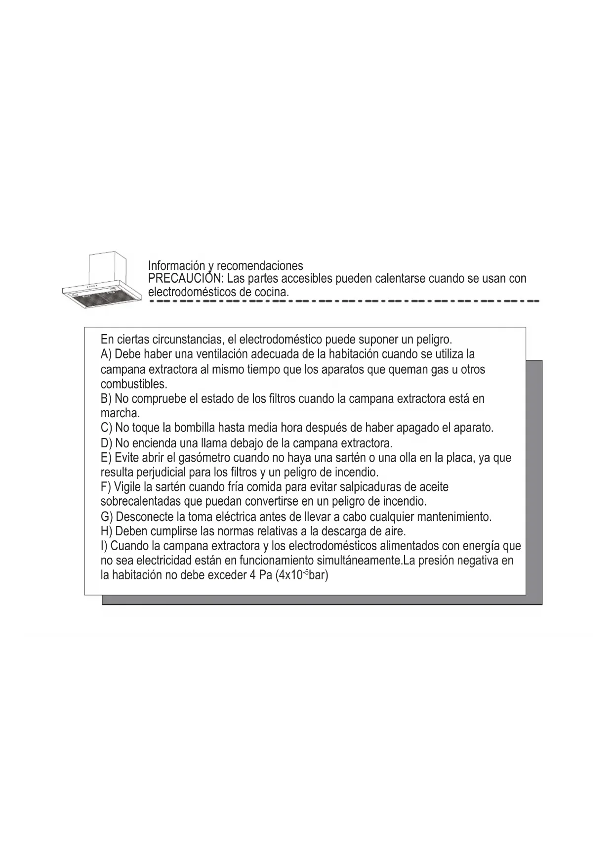 bar) Información y recomendaciones PRECAUCIÓN: Las partes accesibles pueden calentarse cuando se usan con electrodomésticos de cocina.J) Para evitar riesgos, el fabricante, su representante de servicio o cualquier otra persona cualificada deben cambiar cualquier cable de alimentación que esté dañado. K) Este aparato pueden utilizarlo niños/as a partir de 8 años de edad y personas con facultades físicas, sensoriales o mentales reducidas, o con falta de experiencia y conocimiento, si lo emplean bajo supervisión o se les instruye acerca de los aspectos de seguridad del producto y entienden los riesgos que comporta. Los niños no deben jugar con el electrodoméstico. Su limpieza y mantenimiento no debe ser realizado por parte de niños a menos que sean mayores de 8 años y estén bajo supervisión. L) la campana extractora está pensada para instalarse sobre una placa que no tenga más de cuatro elementos. M) Su uso debe limitarse a interiores y a un uso doméstico. N) Cuando el aparato no esté en uso y antes de limpiarlo, desenchúfelo de la toma de corriente. O) ¡Atención! Tenga en cuenta las advertencias en la hoja de instrucciones sobre el funcionamiento del aparato cuando se descarga aire de la habitación P) Existe un riesgo de incendio si la limpieza no se realiza de acuerdo con las instrucciones. Información y recomendaciones PRECAUCIÓN: Las partes accesibles pueden calentarse cuando se usan con electrodomésticos de cocina.Q) El aire no debe conducirse a un conducto de extracción de humos de aparatos de gas u otros combustibles (no es aplicable a los aparatos que sólo reconducen el aire a la habitación).