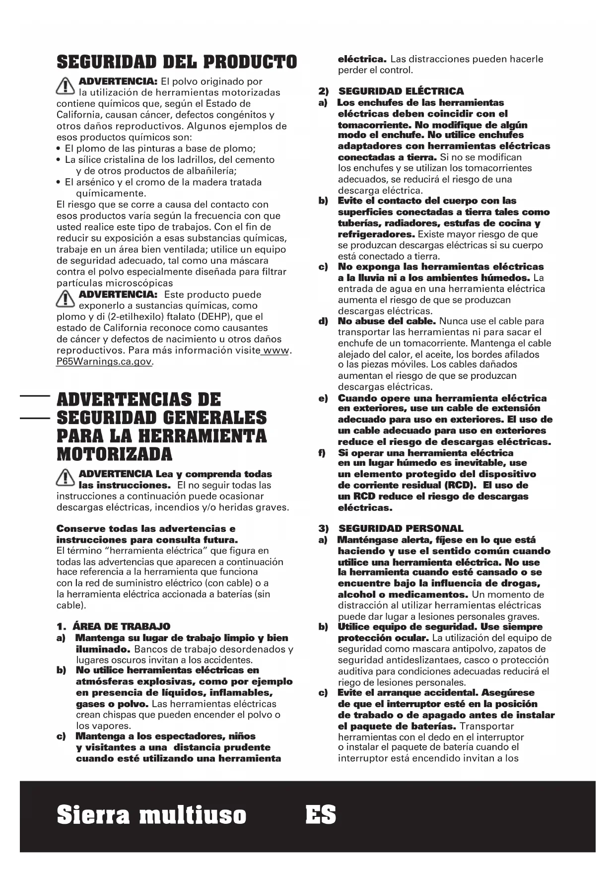 - El arsénico y el cromo de la madera tratada químicamente. El riesgo que se corre a causa del contacto con esos productos varía según la frecuencia con que usted realice este tipo de trabajos. Con el fin de reducir su exposición a esas substancias químicas, trabaje en un área bien ventilada; utilice un equipo de seguridad adecuado, tal como una máscara contra el polvo especialmente diseñada para filtrar partículas microscópicas ADVERTENCIA: Este producto puede exponerlo a sustancias químicas, como plomo y di (2-etilhexilo) ftalato (DEHP), que el estado de California reconoce como causantes de cáncer y defectos de nacimiento u otros daños reproductivos. Para más información visite www. P65Warnings.ca.gov. ADVERTENCIAS DE SEGURIDAD GENERALES