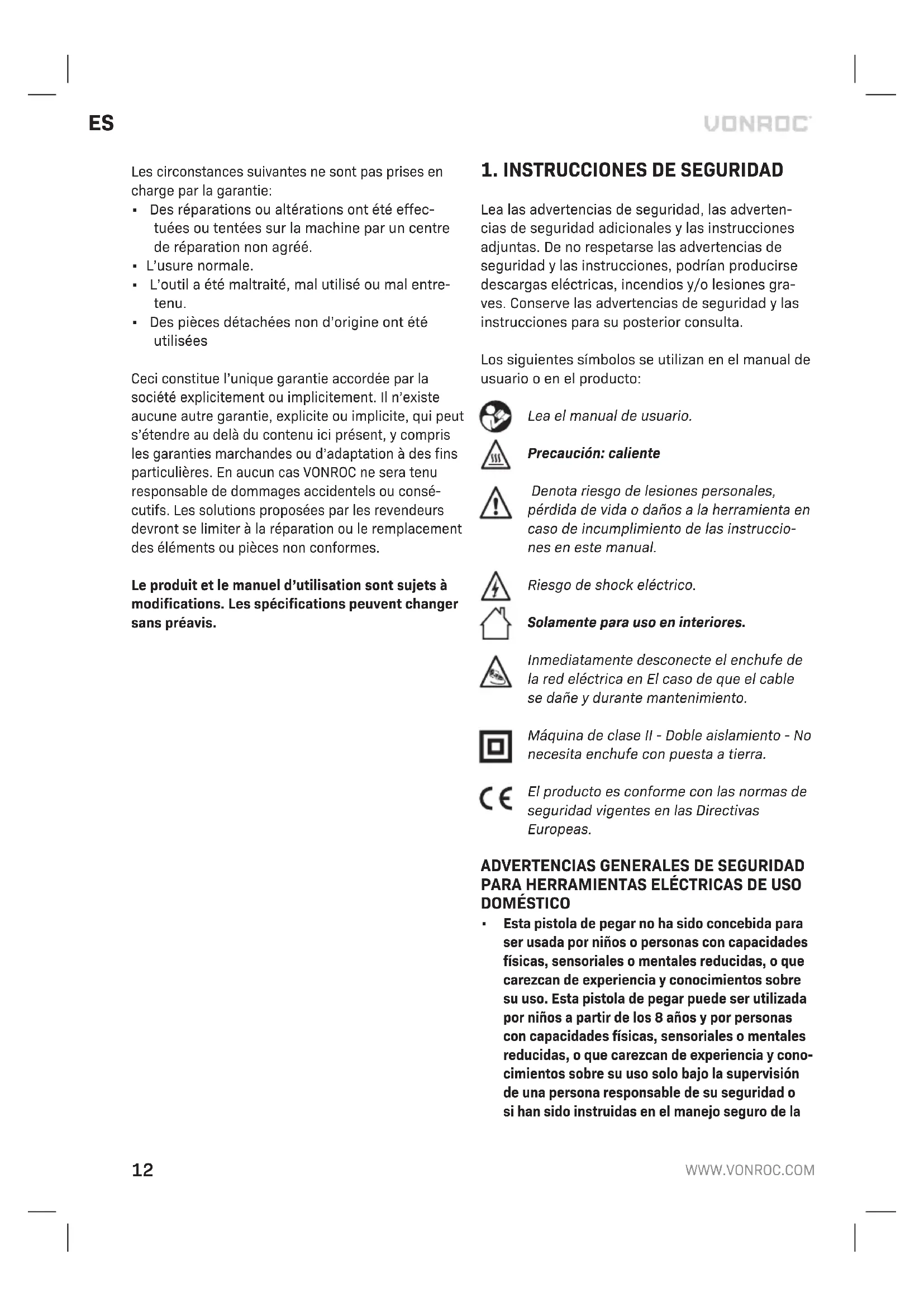 - Si se han utilizado piezas de repuesto no origi- nales. La presente constituye la única garantía implícita y explícita que ofrece la compañía. No existen otras garantías explícitas o implícitas que excedan las citadas aquí, incluidas las garantías implícitas de comerciabilidad e idoneidad para una finalidad en especial. VONROC no será considerada responsable en ningún caso por daños incidentales o consecuen- tes. Los recursos a disposición de los distribuidores se limitan a la reparación o a la sustitución de las unidades o piezas no conformes. El producto y el manual de usuario están sujetos a variaciones. Las especificaciones pueden variarse sin previo aviso.IT