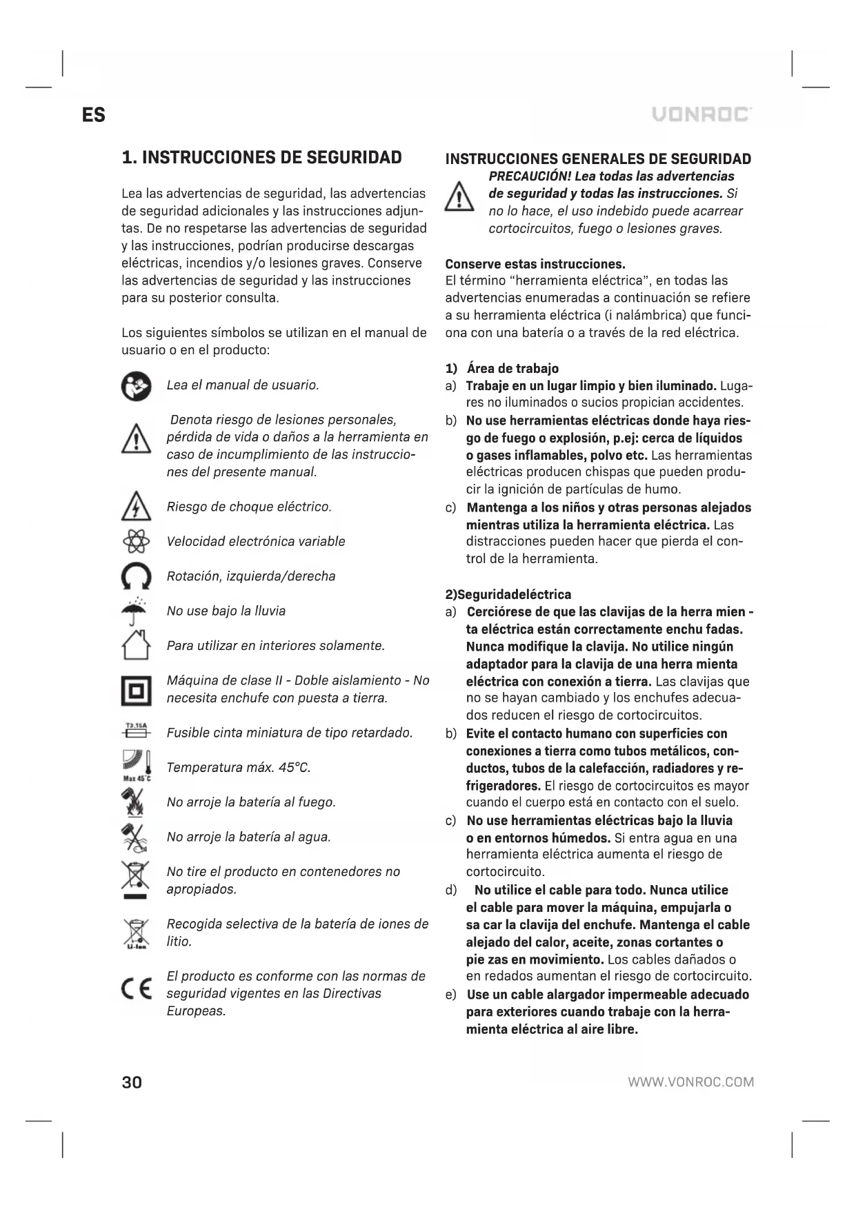 - Si se han utilizado piezas de repuesto no origi- nales. La presente constituye la única garantía implícita y explícita que ofrece la compañía. No existen otras garantías explícitas o implícitas que excedan las citadas aquí, incluidas las garantías implícitas de comerciabilidad e idoneidad para una finalidad en especial. VONROC no será considerada responsa- ble en ningún caso por daños incidentales o consecuentes. Los recursos a disposición de los distribuidores se limitan a la reparación o a la sus- titución de las unidades o piezas no conformes. El producto y el manual de usuario están sujetos a variaciones. Las especificaciones pueden variarse sin previo aviso.IT